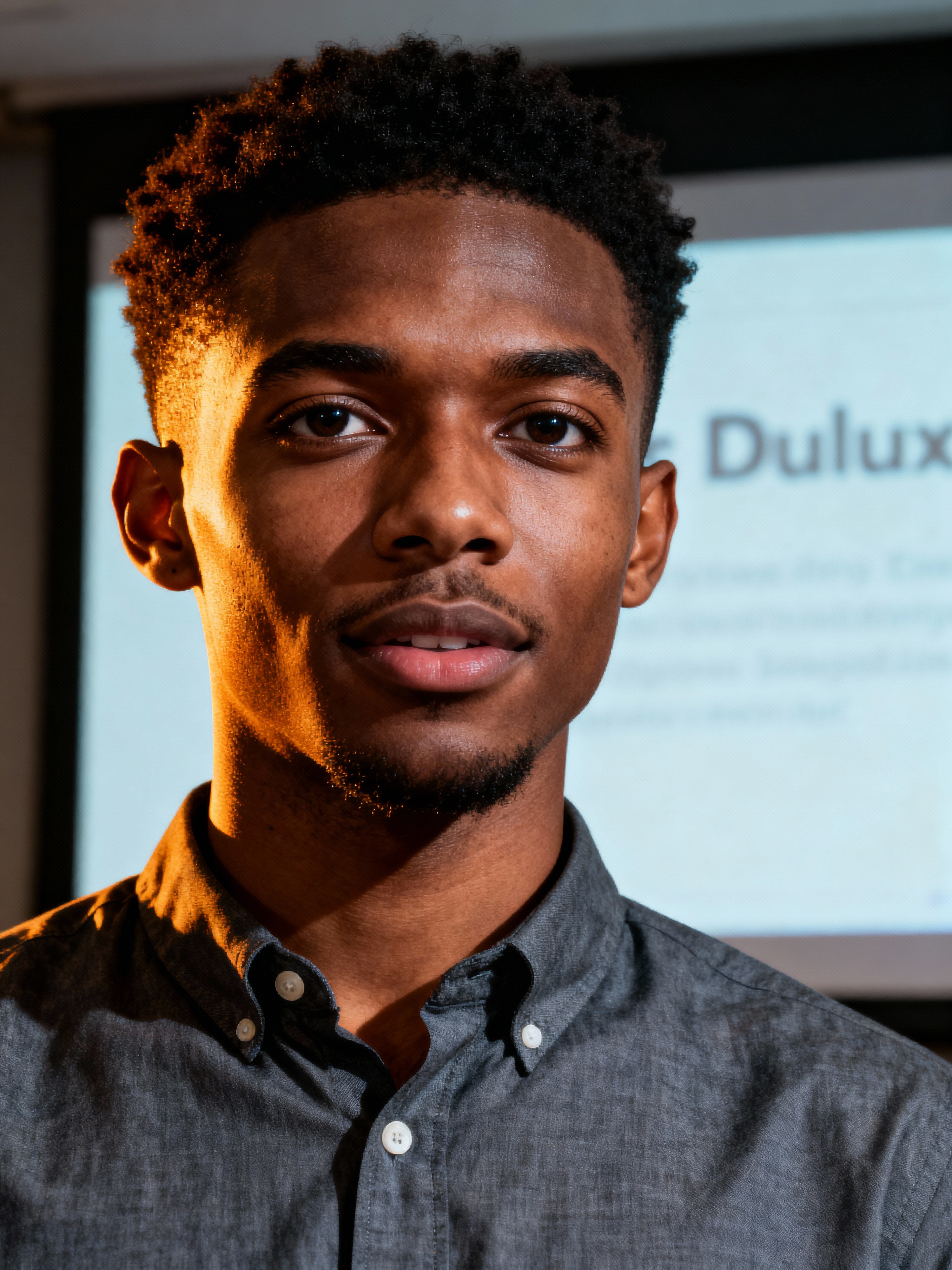 dynamic model dressed in contemporary button-up with no tie pitching to investors, presentation screen background, confident stance