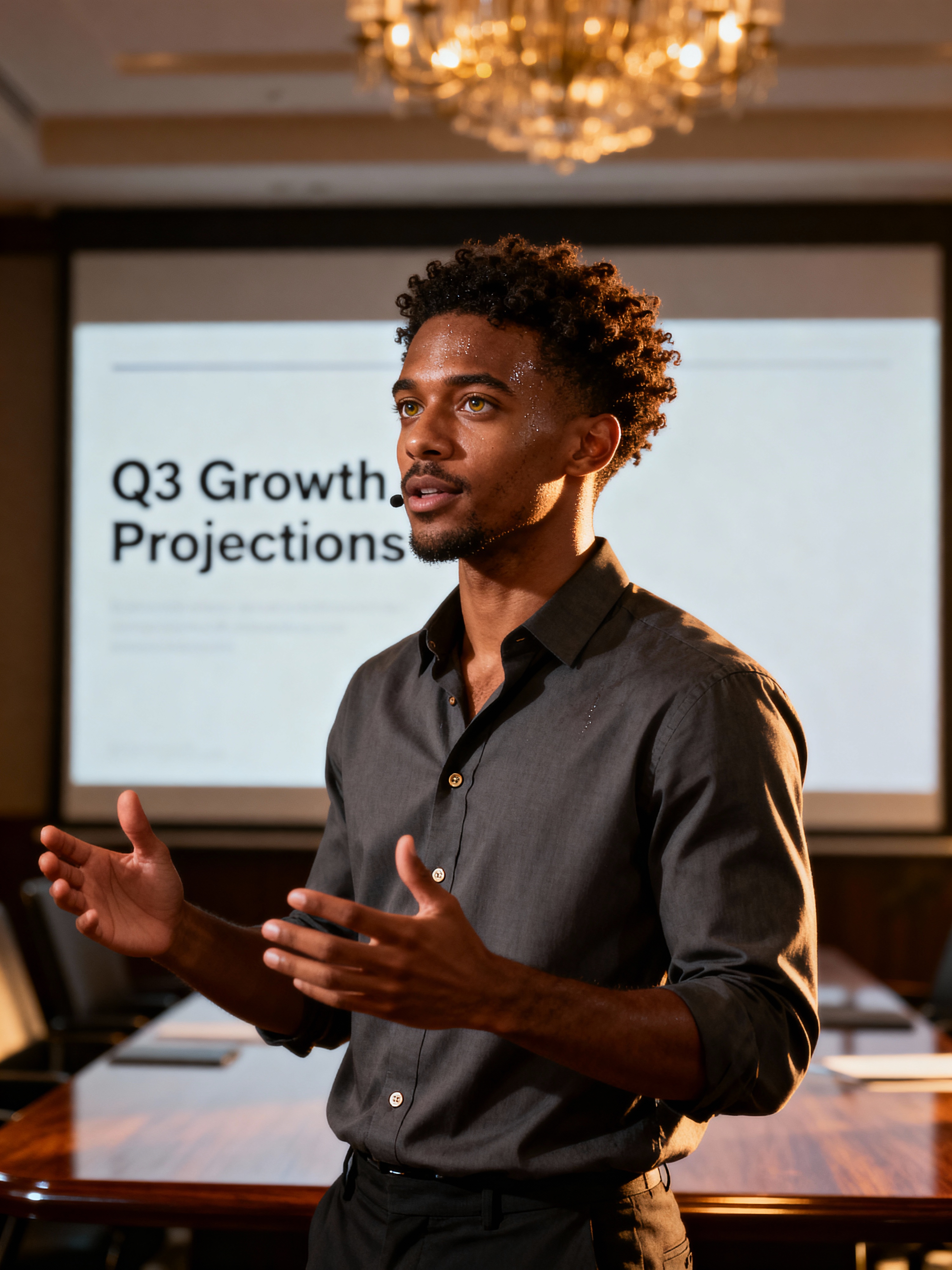 dynamic model dressed in contemporary button-up with no tie pitching to investors, presentation screen background, confident stance
