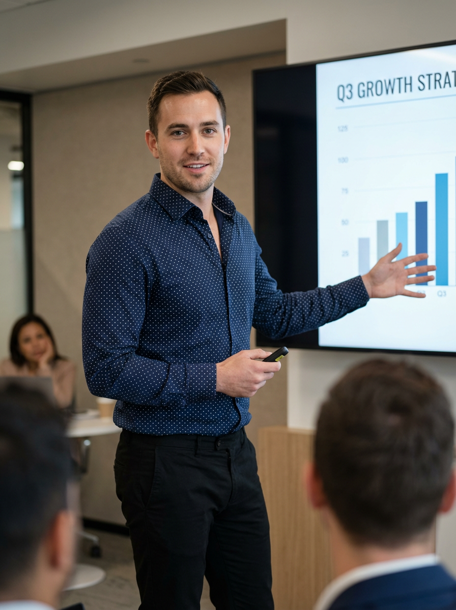 dynamic model dressed in contemporary button-up with no tie pitching to investors, presentation screen background, confident stance