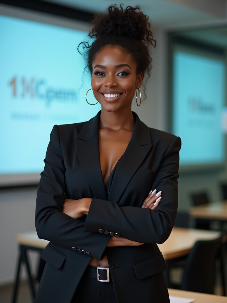 dynamic model dressed in modern business attire with subtle accessories pitching to investors, presentation screen background, confident stance