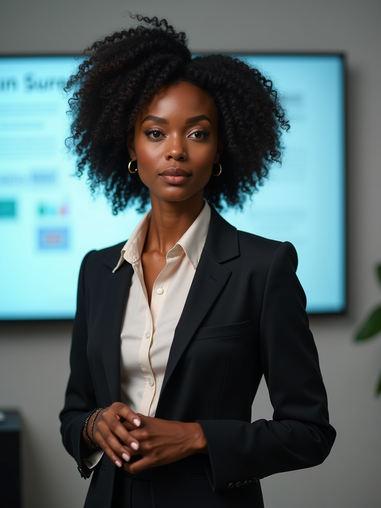 dynamic model dressed in modern business attire with subtle accessories pitching to investors, presentation screen background, confident stance