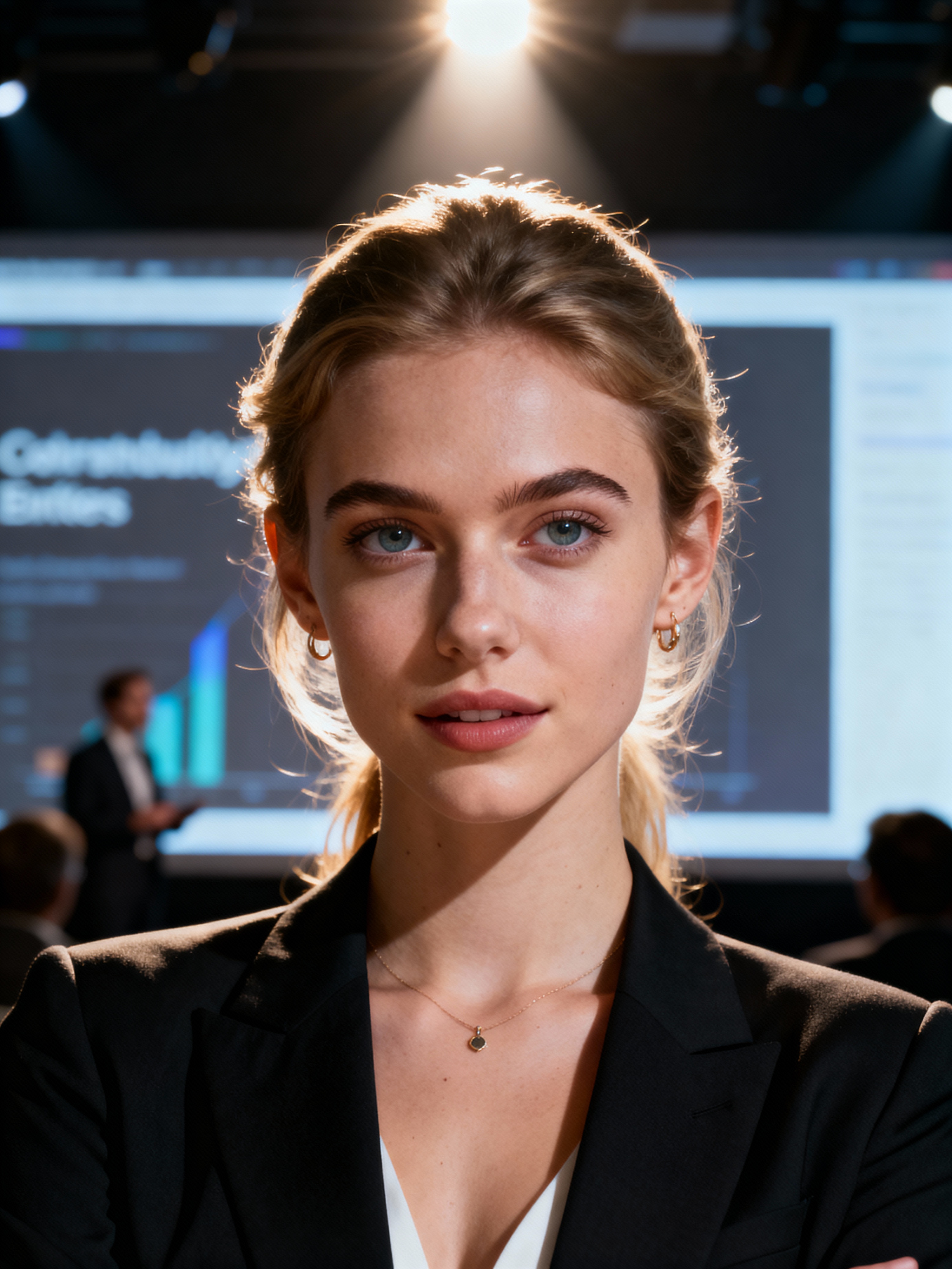 dynamic model dressed in modern business attire with subtle accessories pitching to investors, presentation screen background, confident stance
