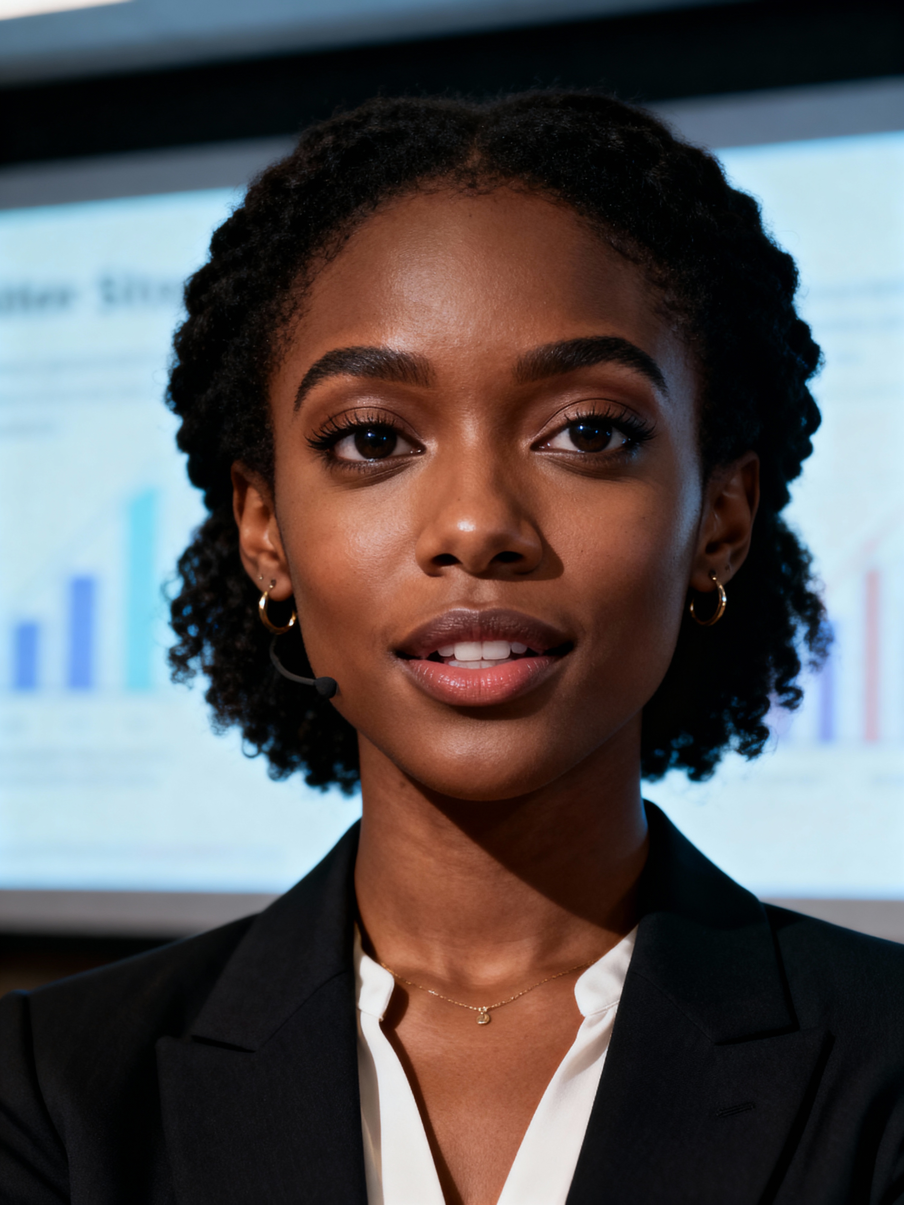 dynamic model dressed in modern business attire with subtle accessories pitching to investors, presentation screen background, confident stance