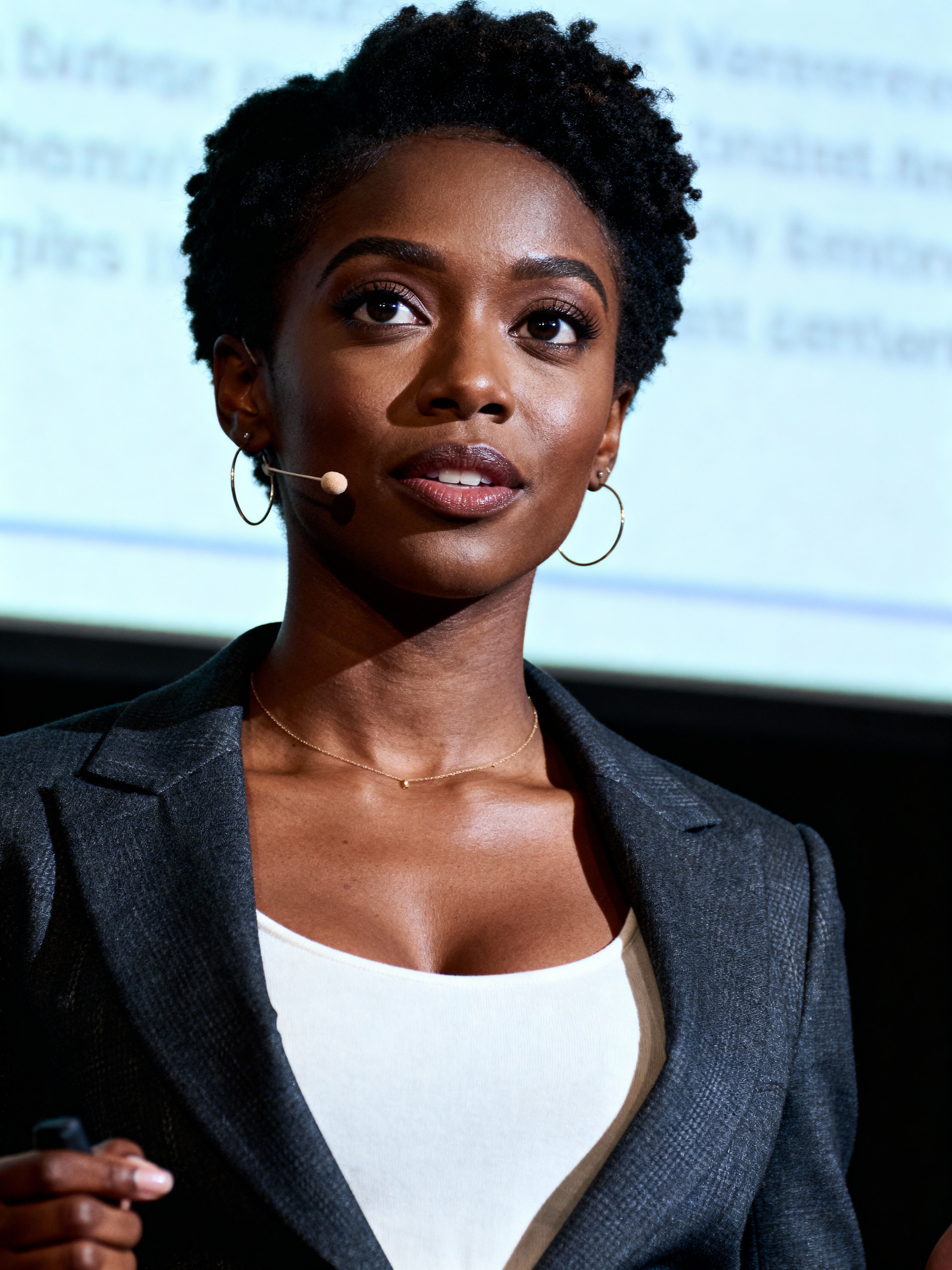 dynamic model dressed in modern business attire with subtle accessories pitching to investors, presentation screen background, confident stance