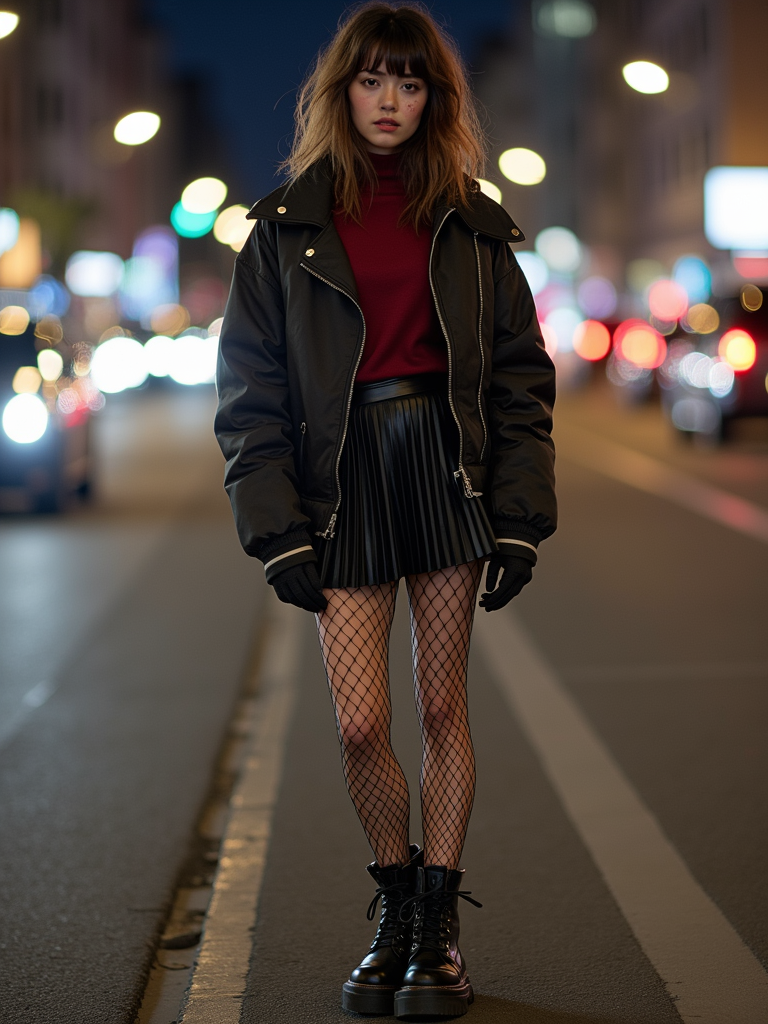 E-Girl streetwear fashion shoot. Fishnet stockings, pleated skirt, chunky boots . Urban background, city lights.