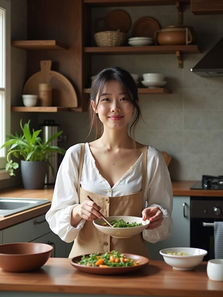 easygoing feminine model cooking a simple meal in a cozy kitchen setting