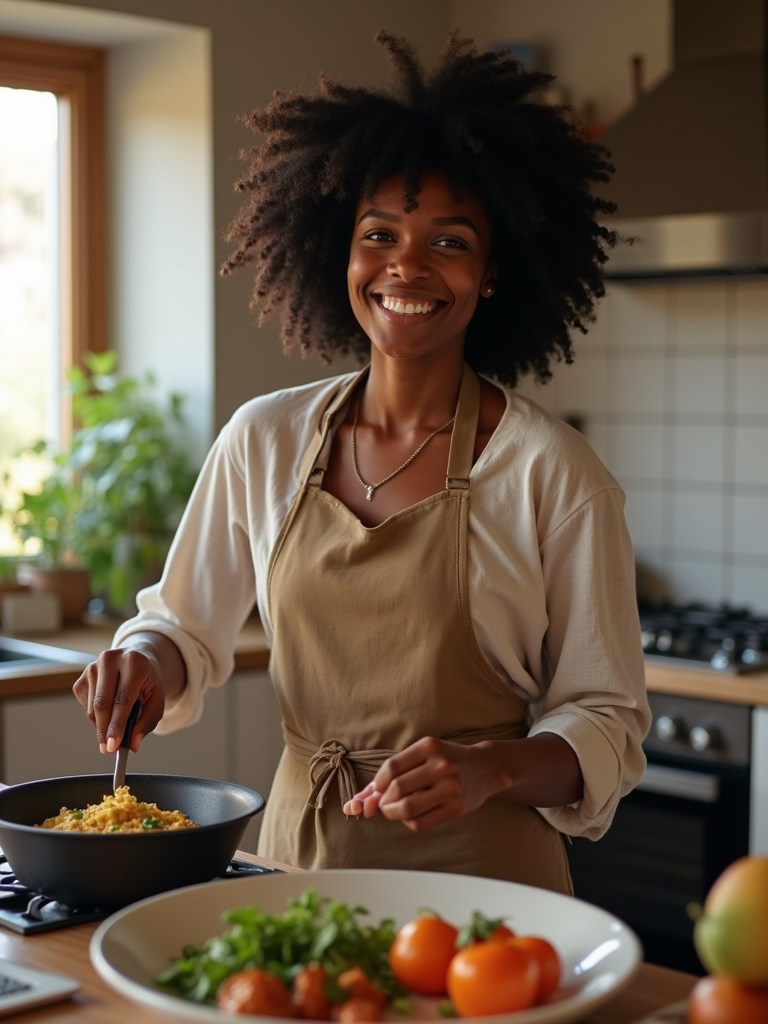 easygoing feminine model cooking a simple meal in a cozy kitchen setting