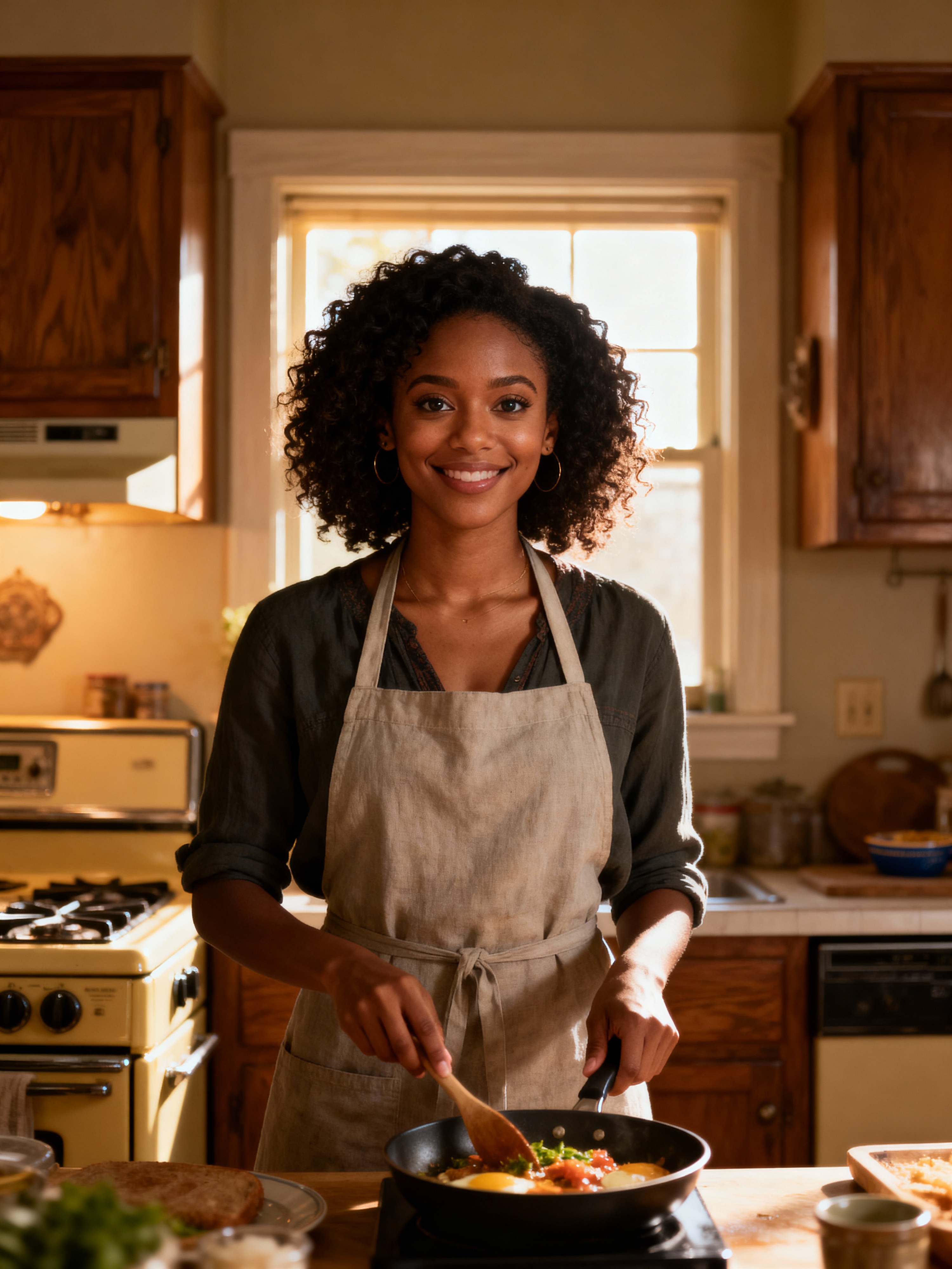 easygoing feminine model cooking a simple meal in a cozy kitchen setting