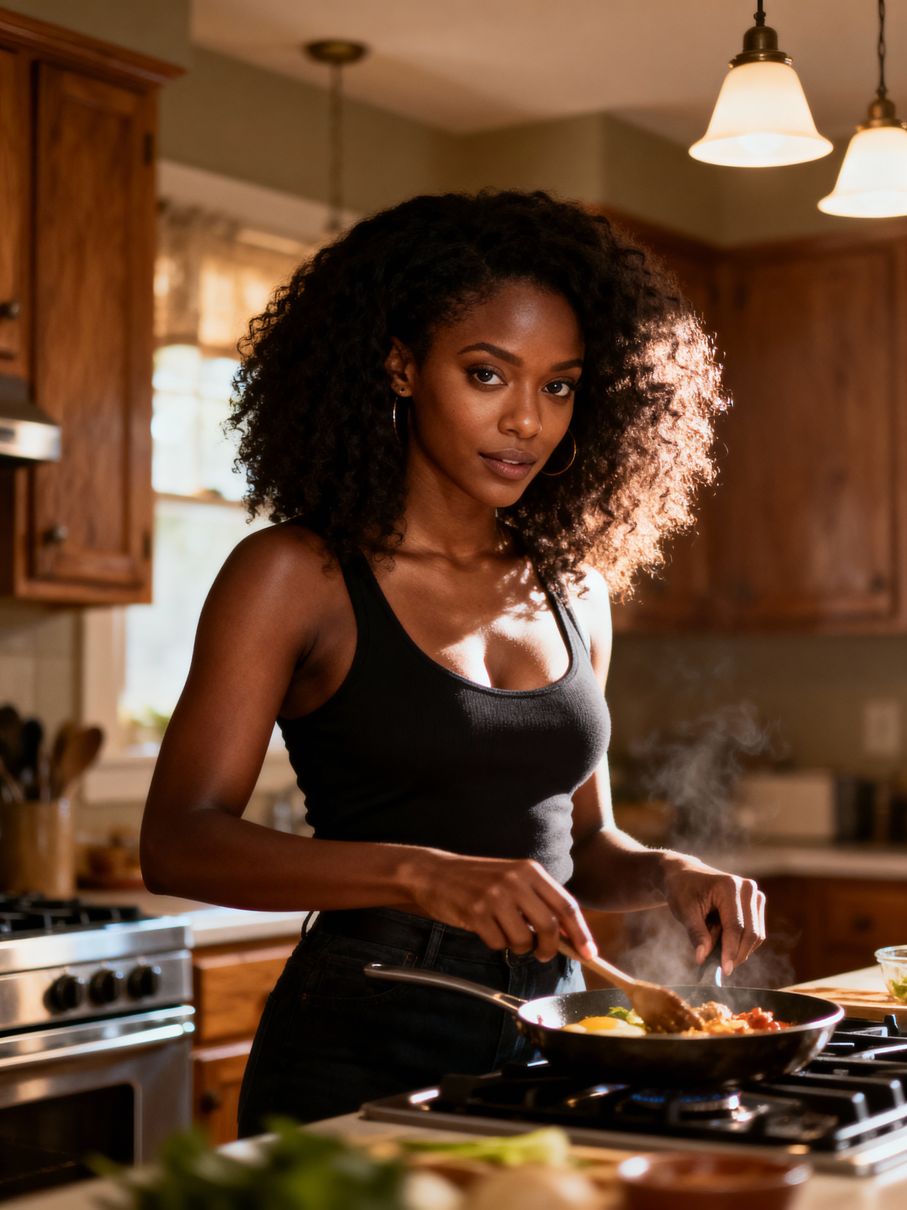 easygoing feminine model cooking a simple meal in a cozy kitchen setting