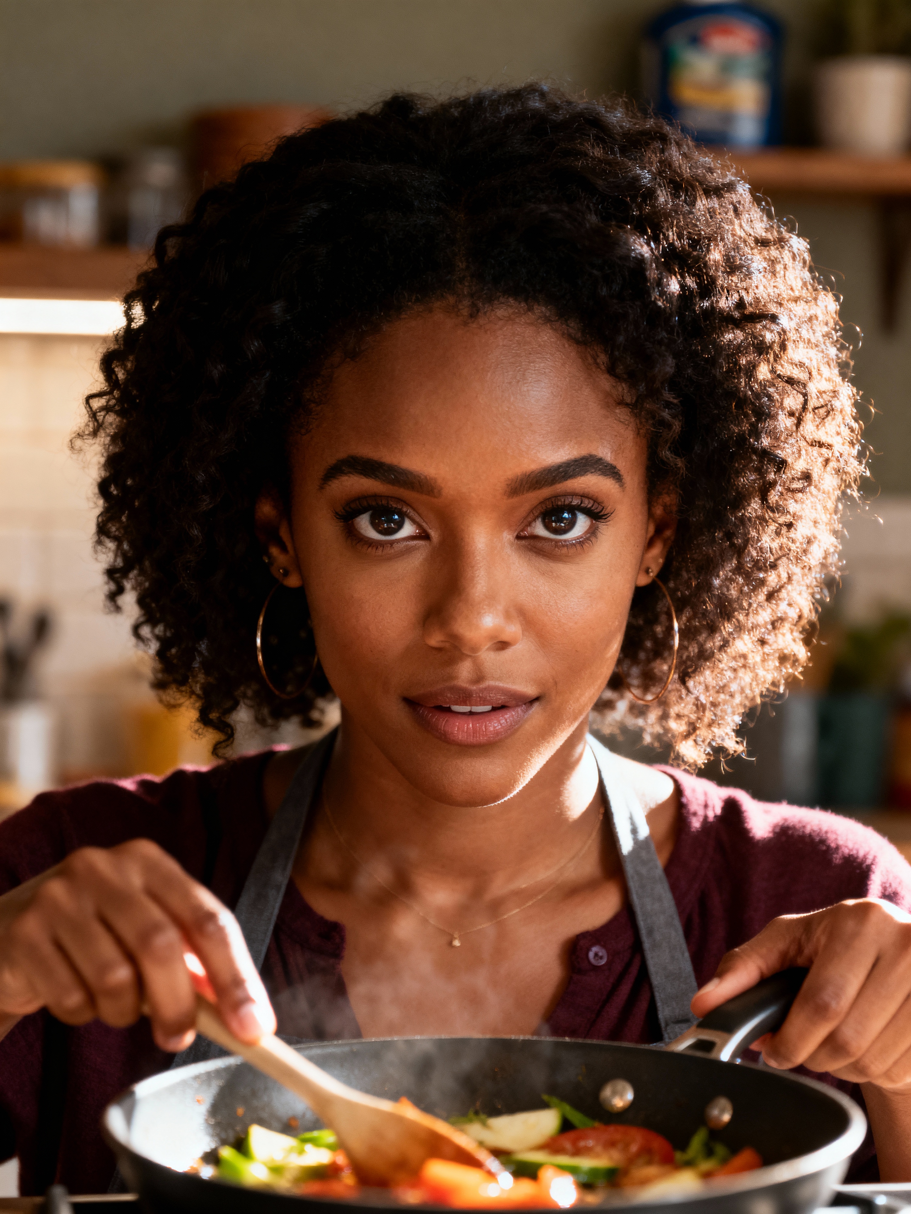 easygoing feminine model cooking a simple meal in a cozy kitchen setting