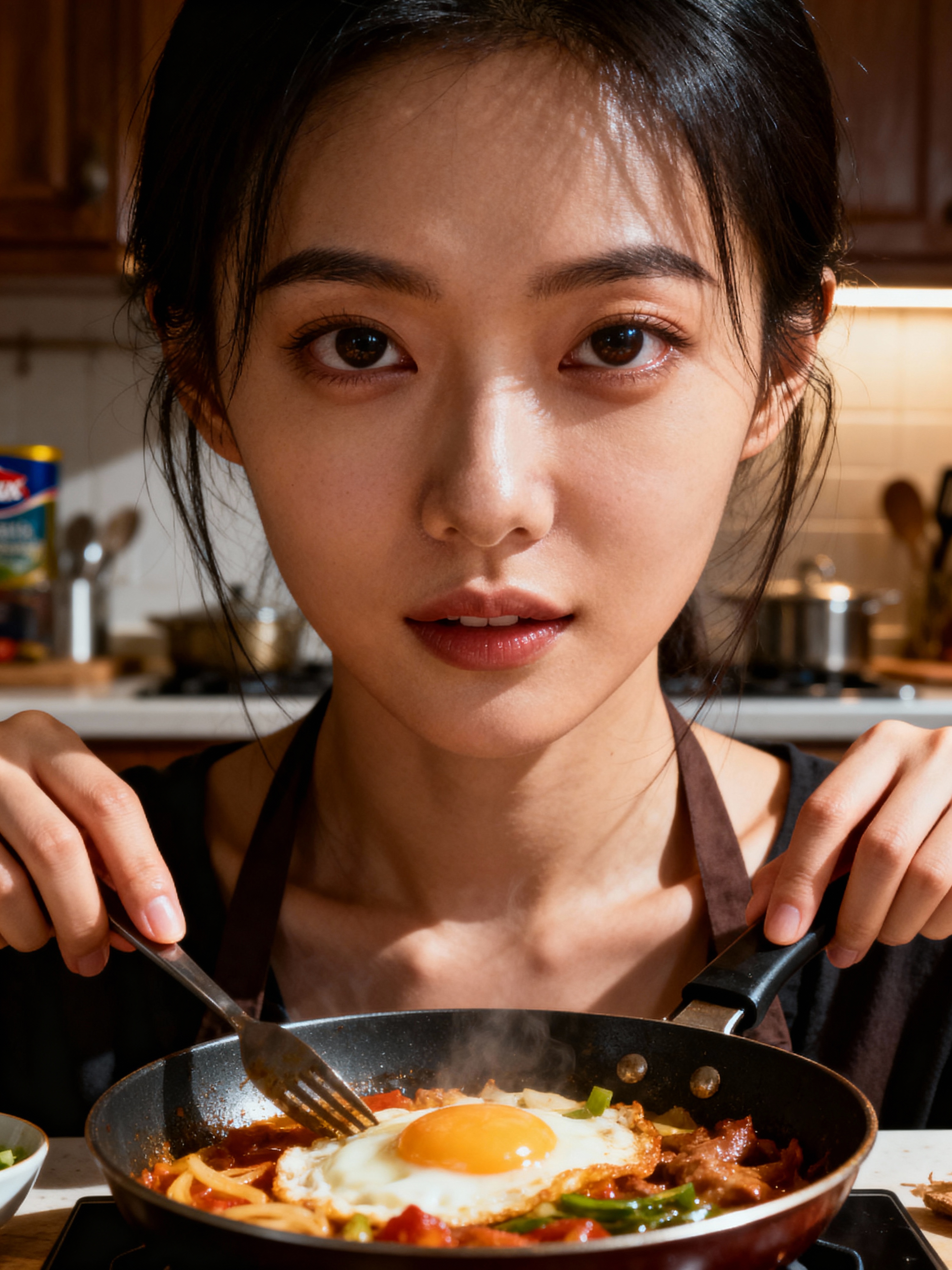easygoing feminine model cooking a simple meal in a cozy kitchen setting