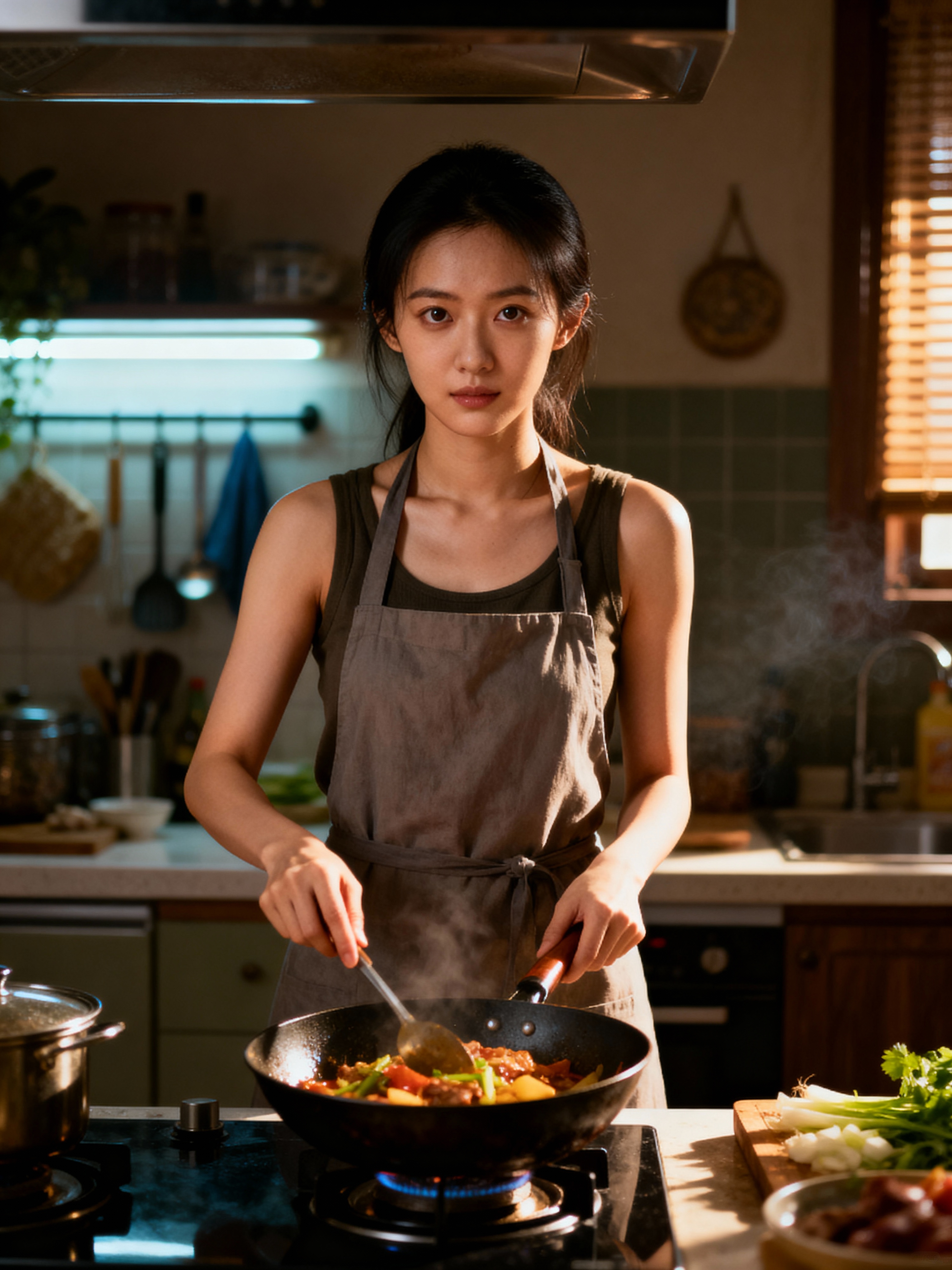 easygoing feminine model cooking a simple meal in a cozy kitchen setting