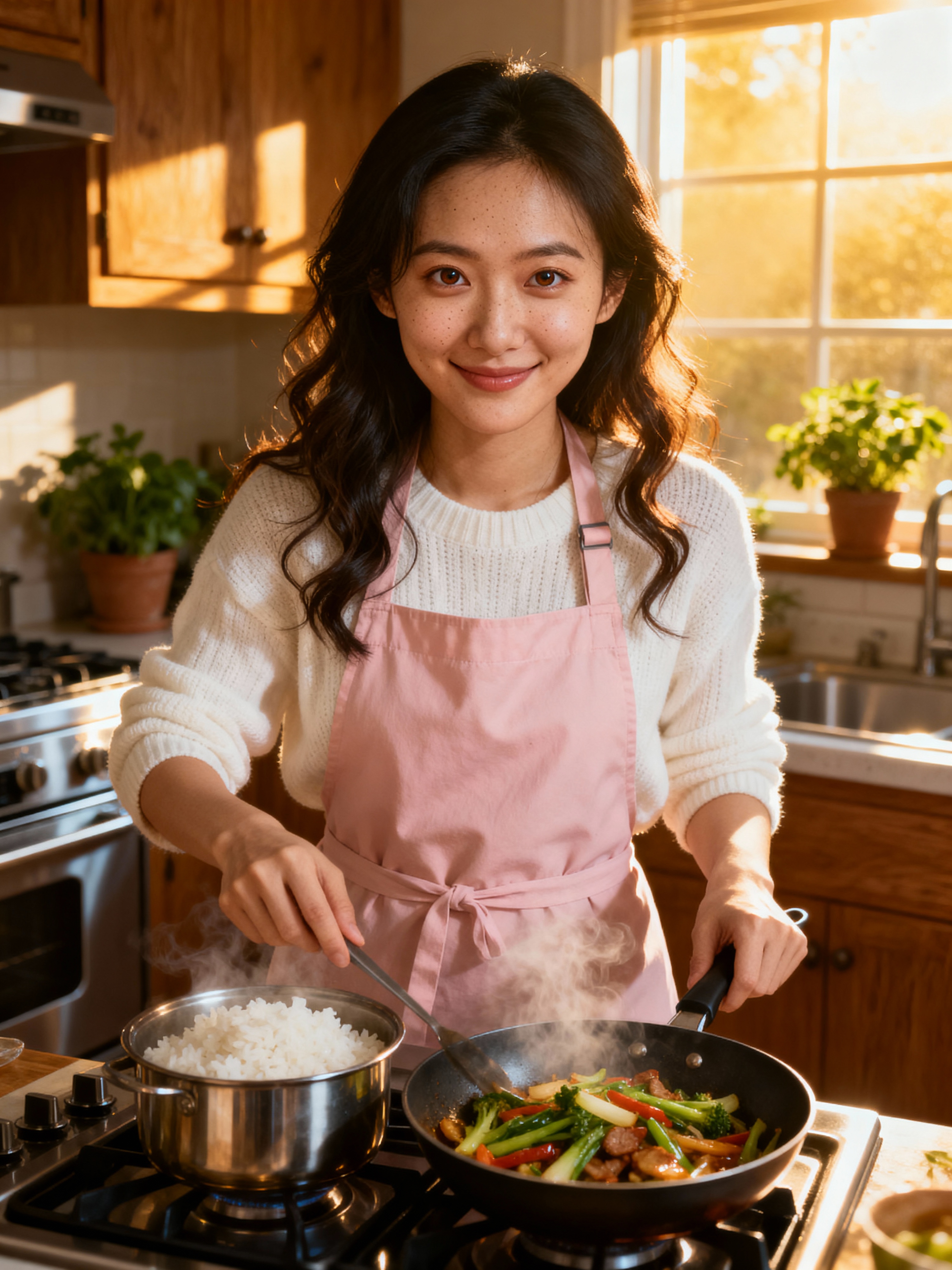 easygoing feminine model cooking a simple meal in a cozy kitchen setting