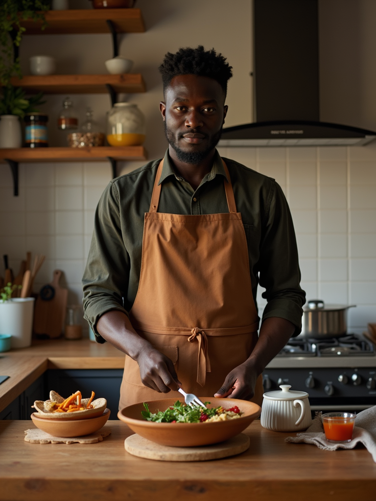 easygoing masculine model cooking a simple meal in a cozy kitchen setting