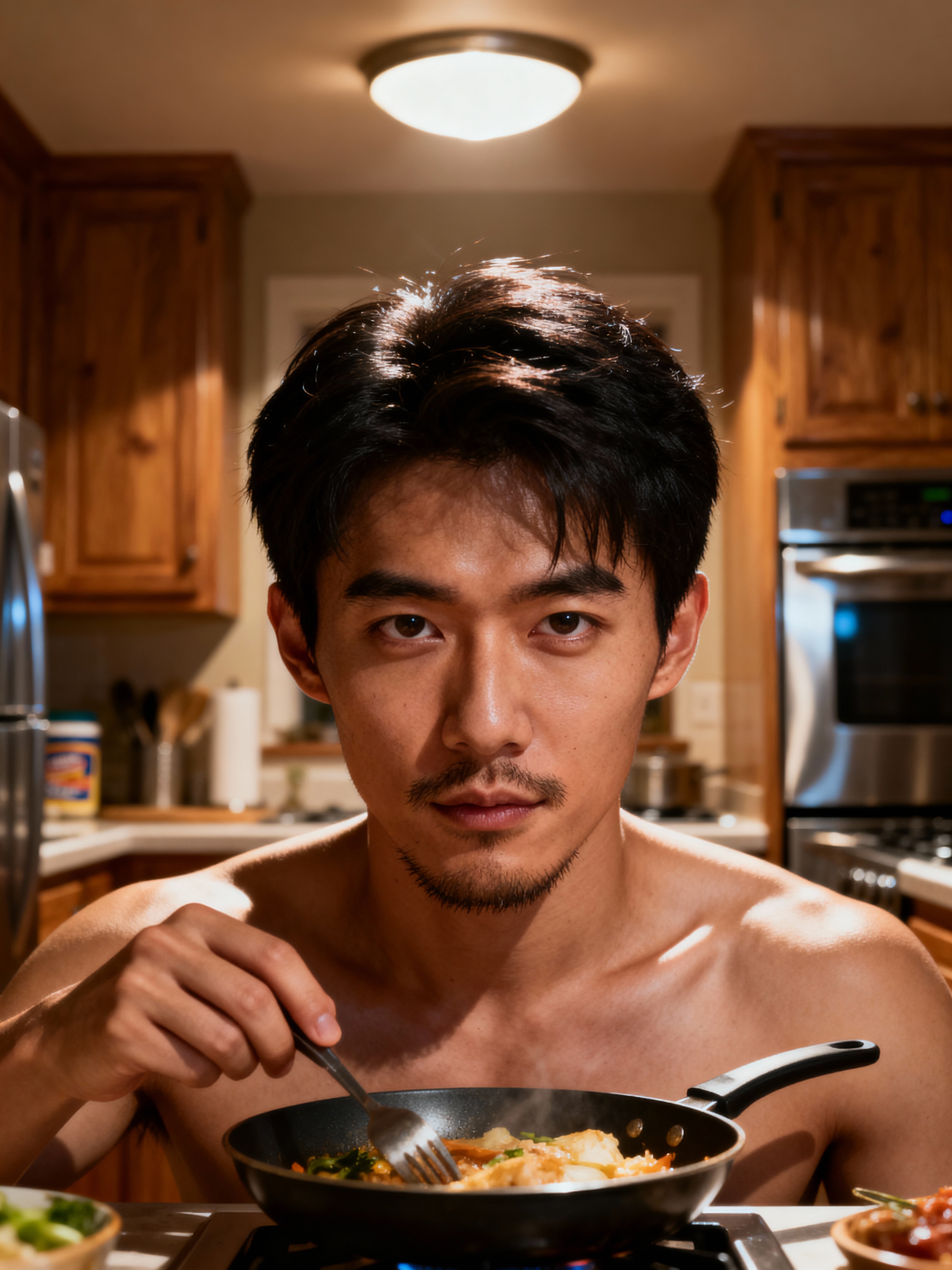 easygoing masculine model cooking a simple meal in a cozy kitchen setting