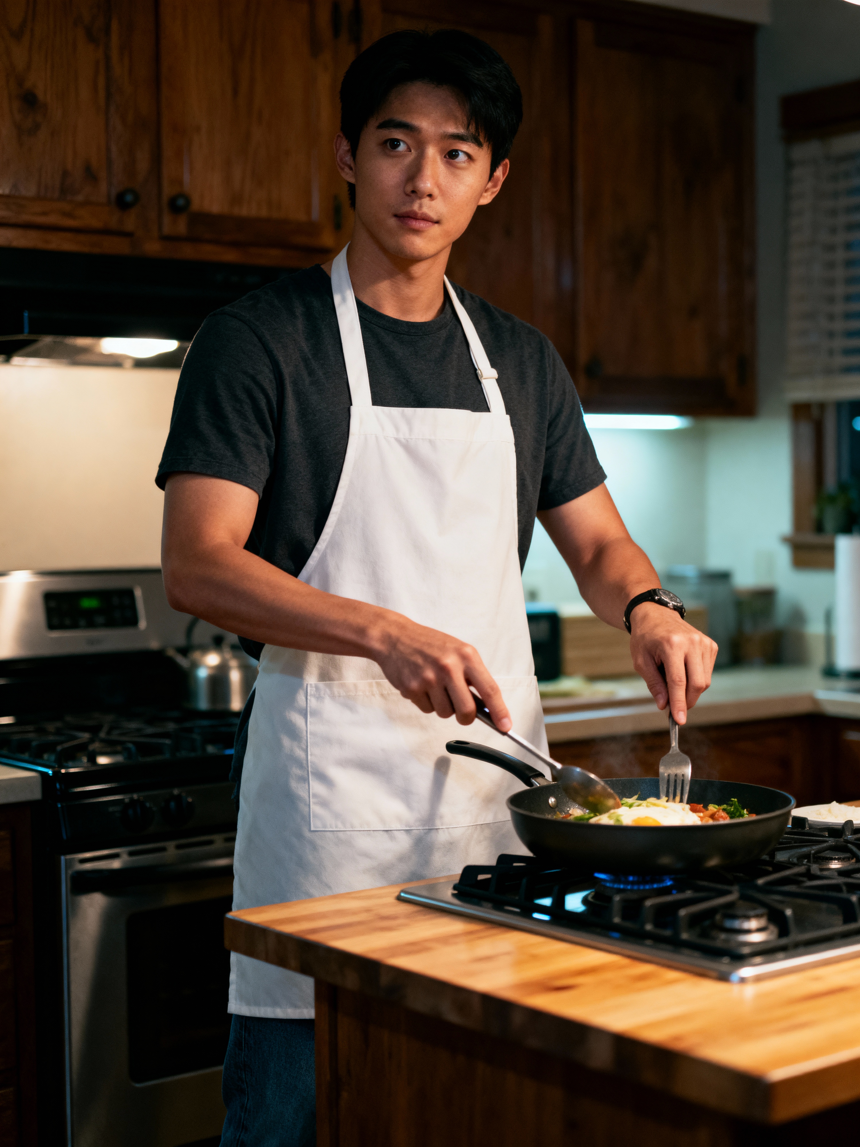 easygoing masculine model cooking a simple meal in a cozy kitchen setting