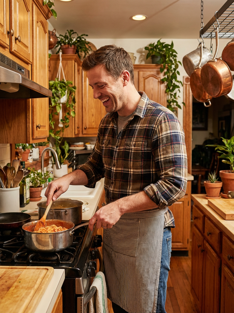 easygoing masculine model cooking a simple meal in a cozy kitchen setting