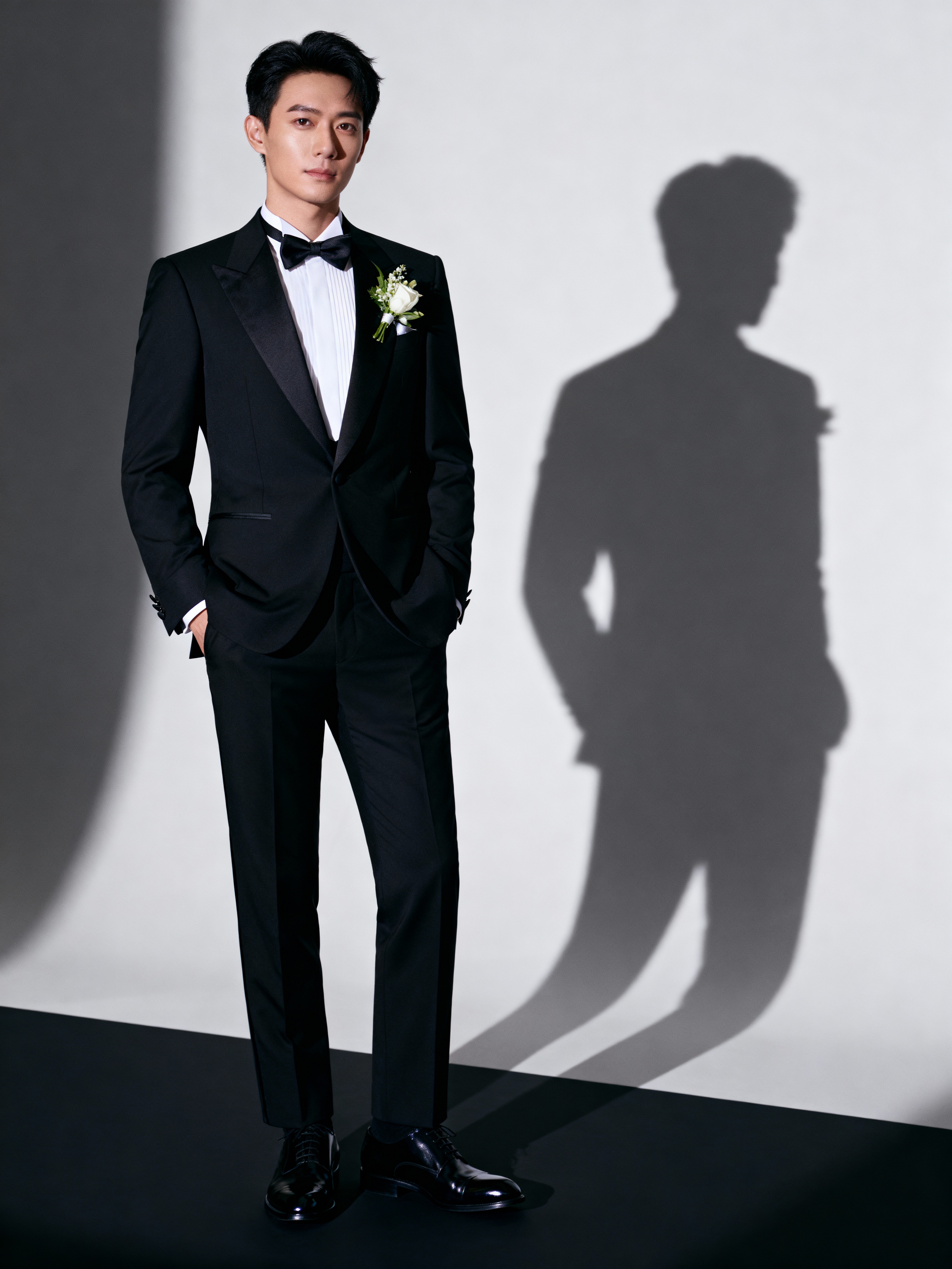 Elegant wedding fashion editorial-style photography. Model wearing a classic tuxedo with polished shoes and boutonnière . Luxury wedding inspiration.