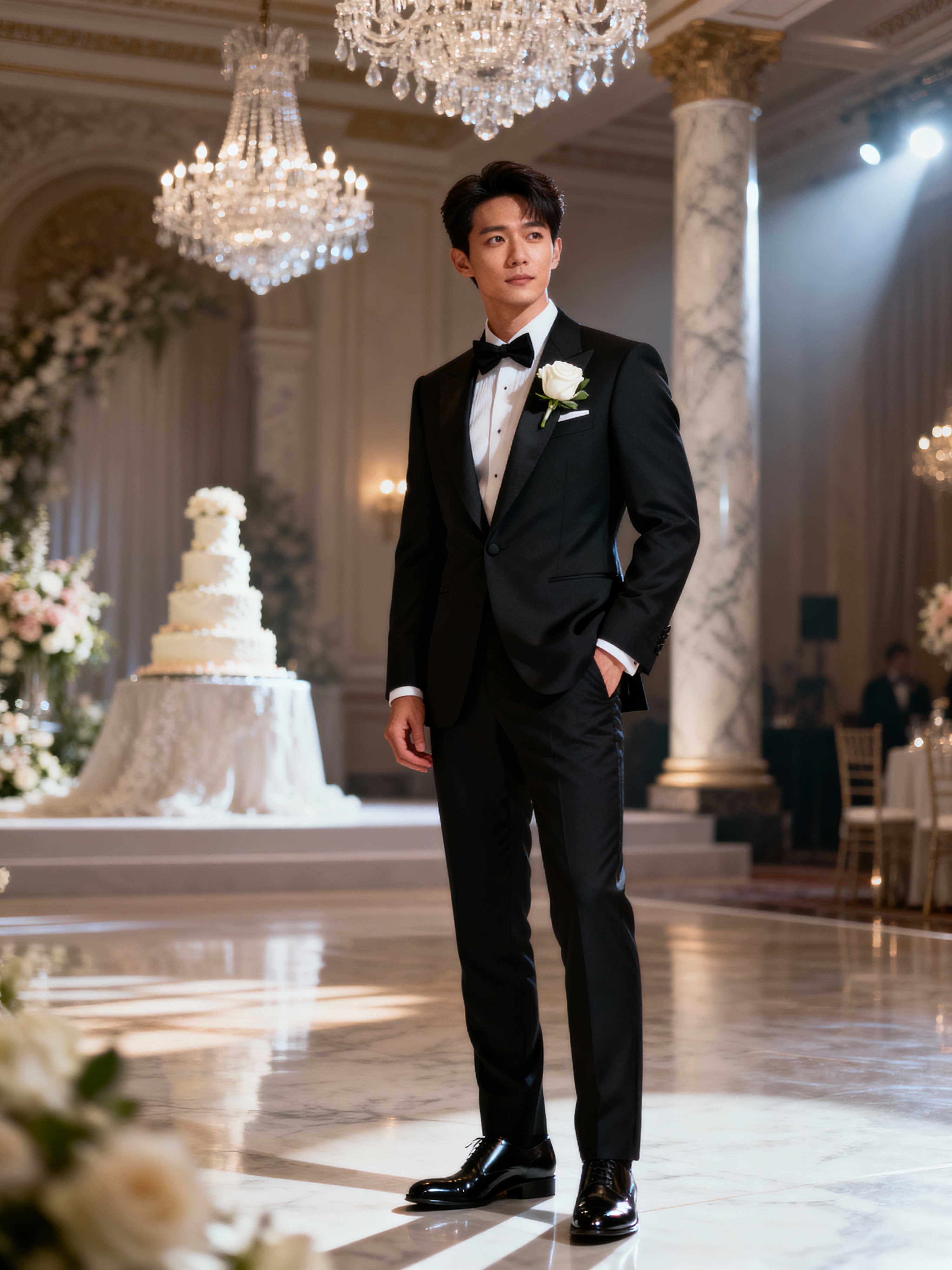 Elegant wedding fashion editorial-style photography. Model wearing a classic tuxedo with polished shoes and boutonnière . Luxury wedding inspiration.