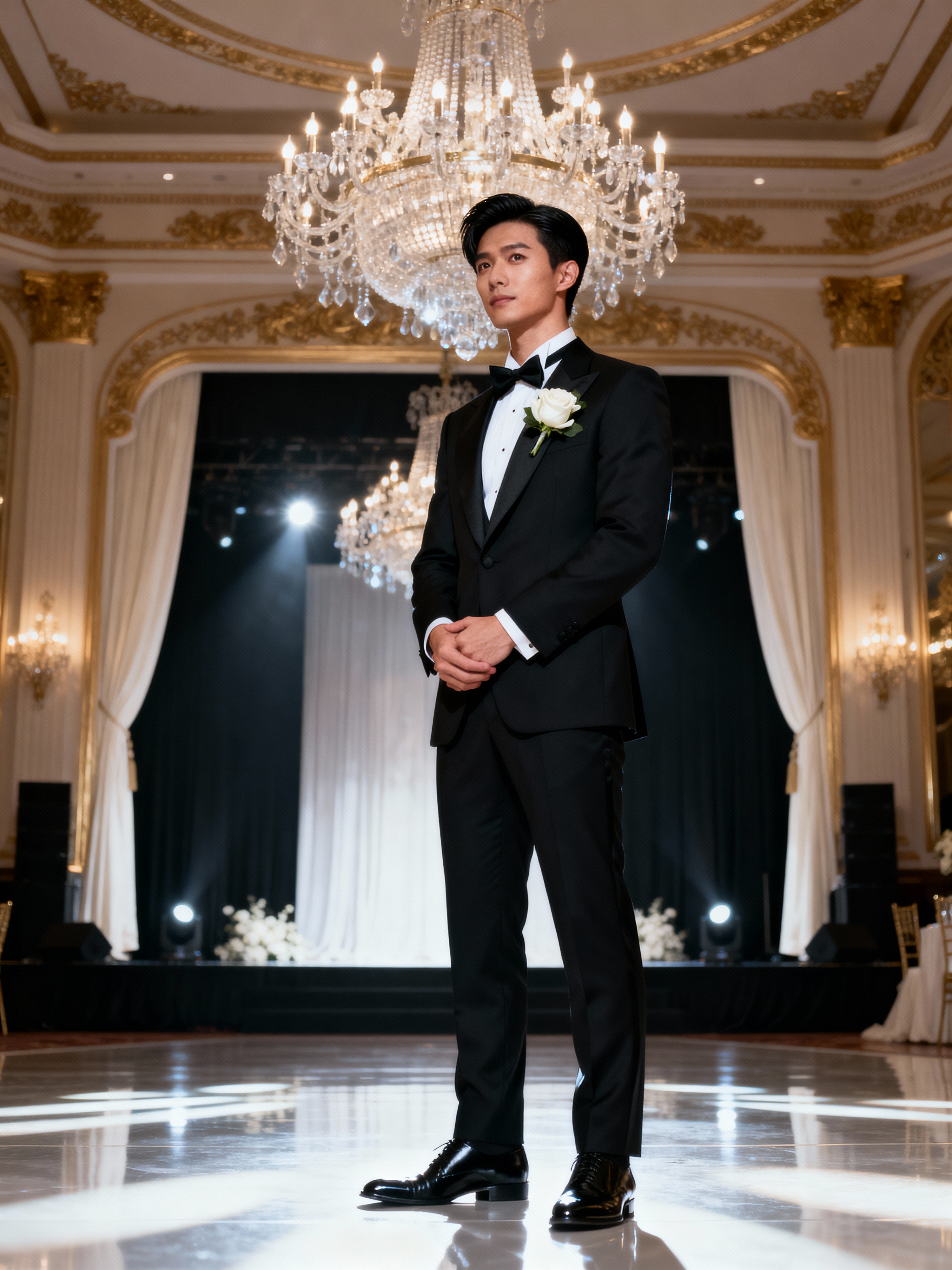 Elegant wedding fashion editorial-style photography. Model wearing a classic tuxedo with polished shoes and boutonnière . Luxury wedding inspiration.