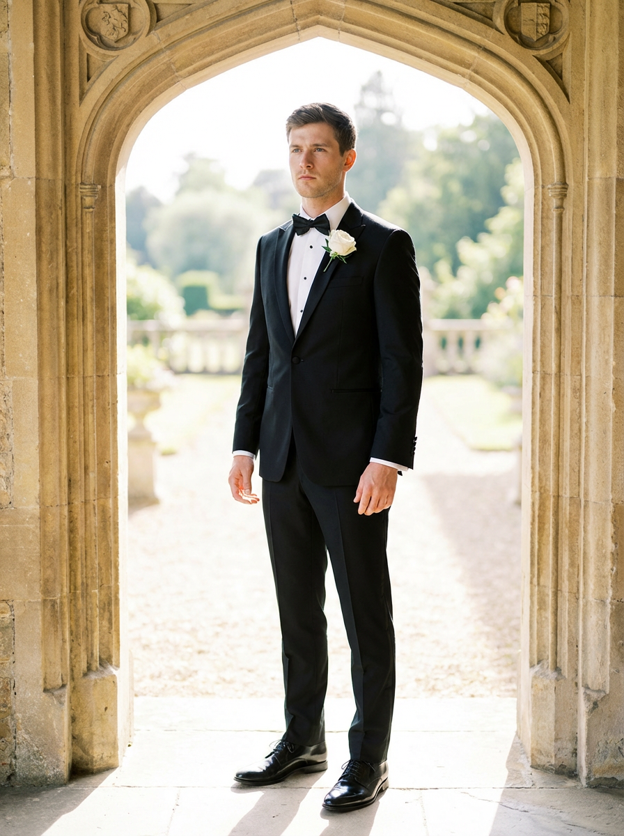 Elegant wedding fashion editorial-style photography. Model wearing a classic tuxedo with polished shoes and boutonnière . Luxury wedding inspiration.