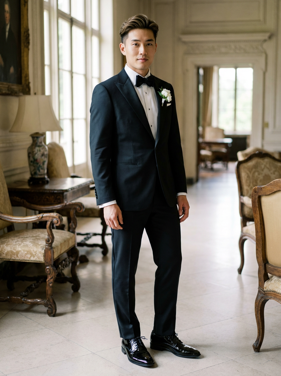 Elegant wedding fashion editorial-style photography. Model wearing a classic tuxedo with polished shoes and boutonnière . Luxury wedding inspiration.