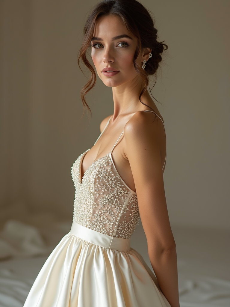 Elegant wedding fashion editorial-style photography. Model wearing a silk gown with delicate pearl details . Luxury wedding inspiration.
