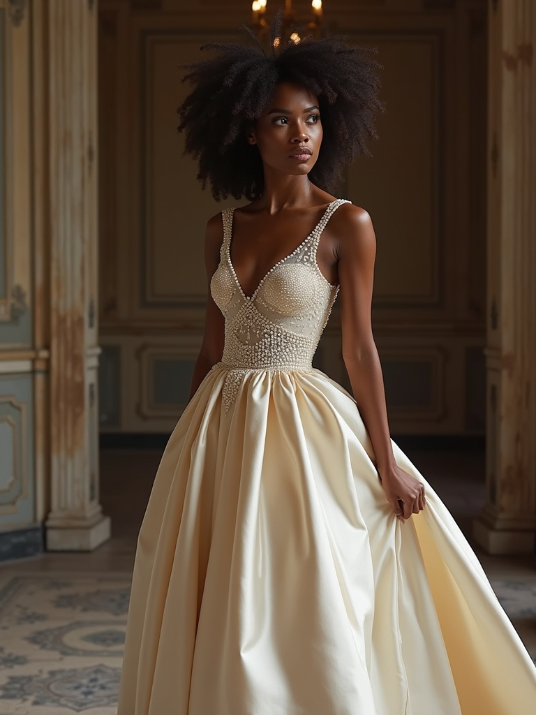 Elegant wedding fashion editorial-style photography. Model wearing a silk gown with delicate pearl details . Luxury wedding inspiration.