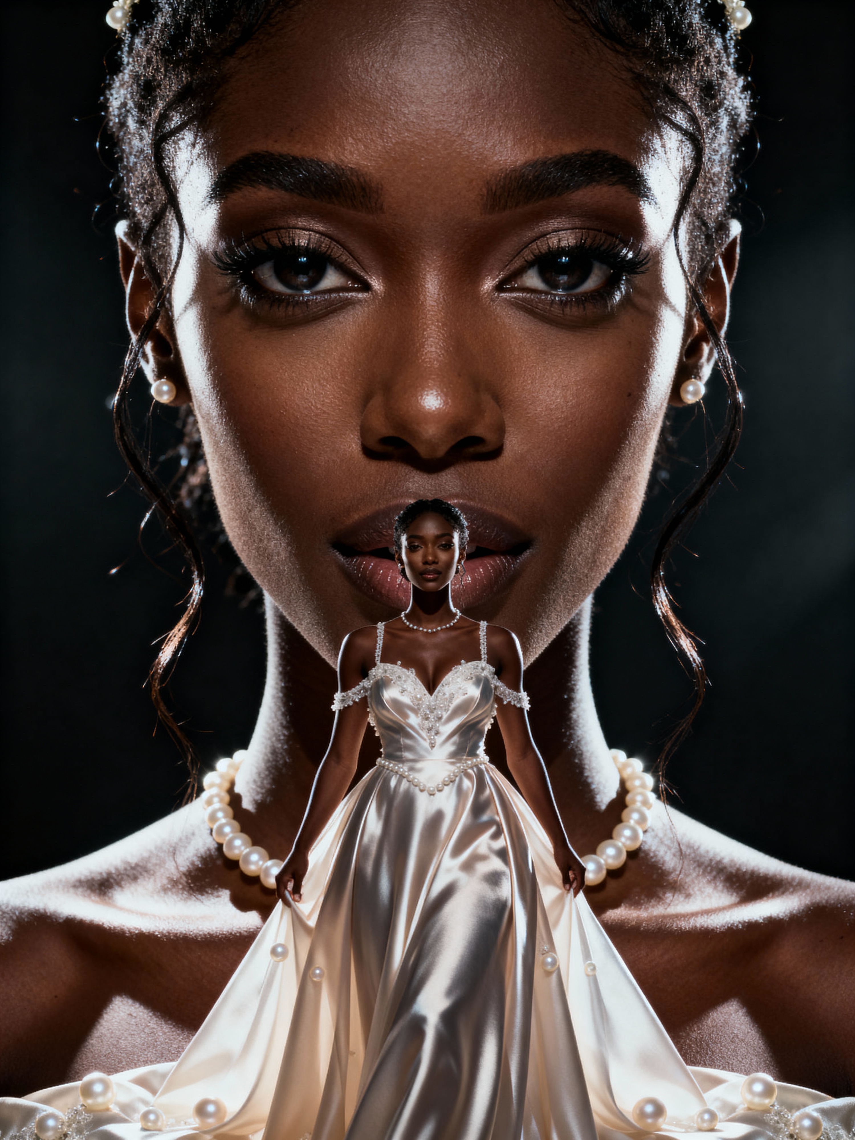 Elegant wedding fashion editorial-style photography. Model wearing a silk gown with delicate pearl details . Luxury wedding inspiration.