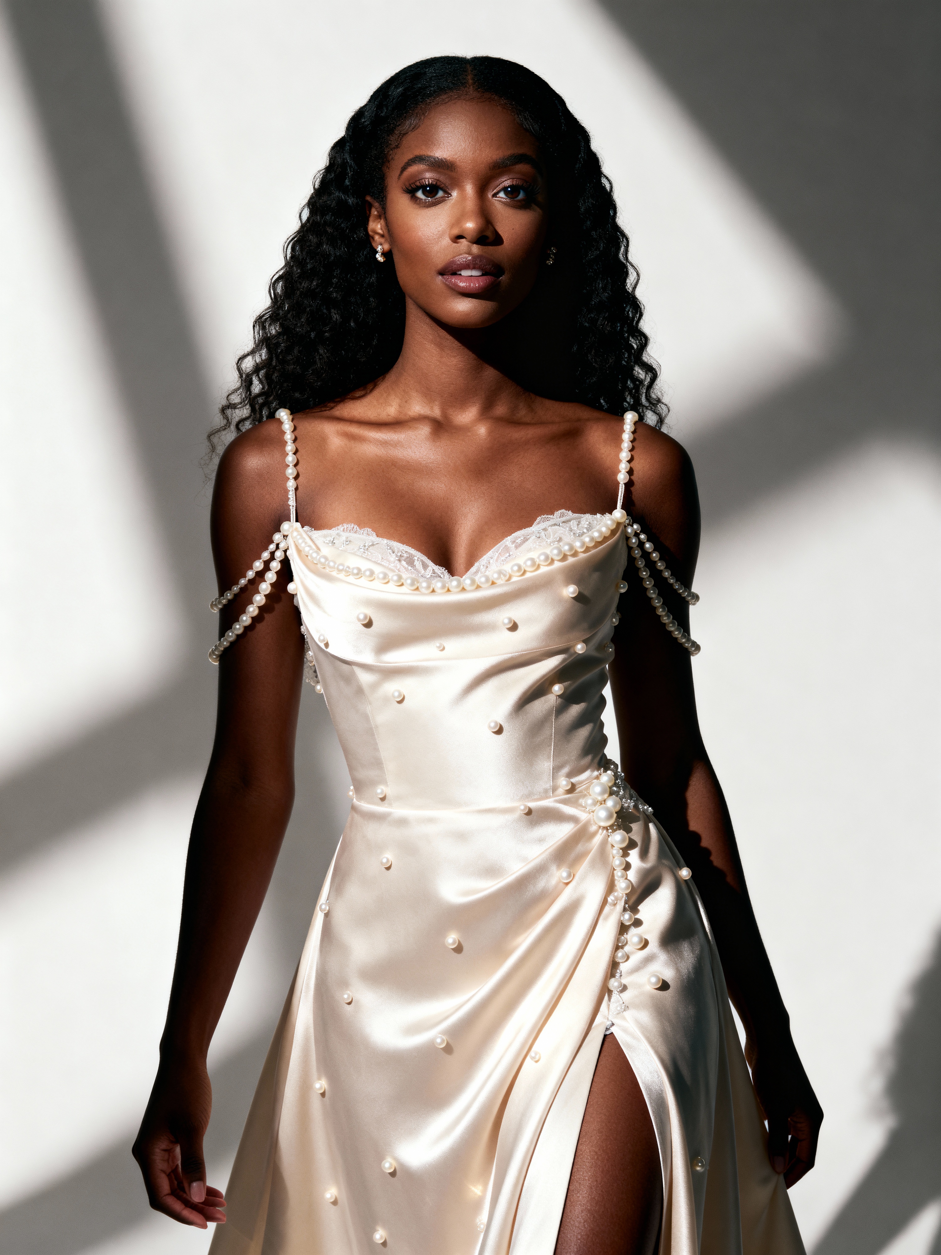 Elegant wedding fashion editorial-style photography. Model wearing a silk gown with delicate pearl details . Luxury wedding inspiration.