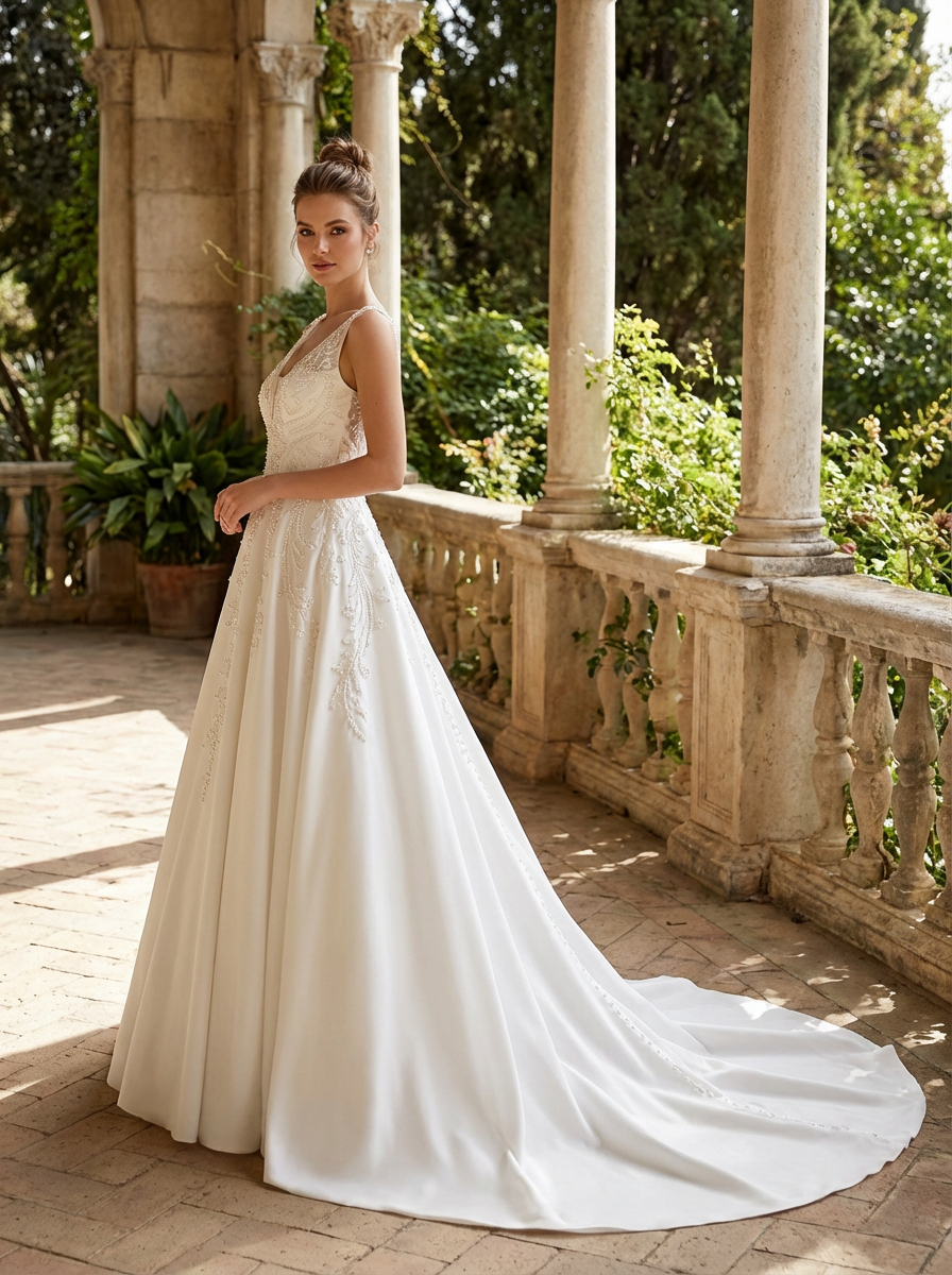 Elegant wedding fashion editorial-style photography. Model wearing a silk gown with delicate pearl details . Luxury wedding inspiration.