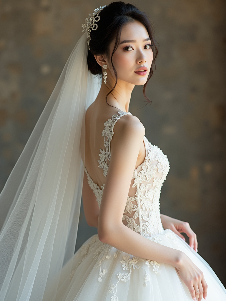 Elegant wedding portrait, showcasing sophisticated bridal or groom styling. Model wearing a delicate lace gown with a flowing veil . High-fashion photography style.