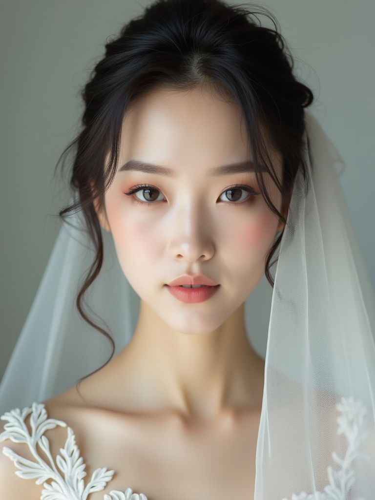 Elegant wedding portrait, showcasing sophisticated bridal or groom styling. Model wearing a delicate lace gown with a flowing veil . High-fashion photography style.