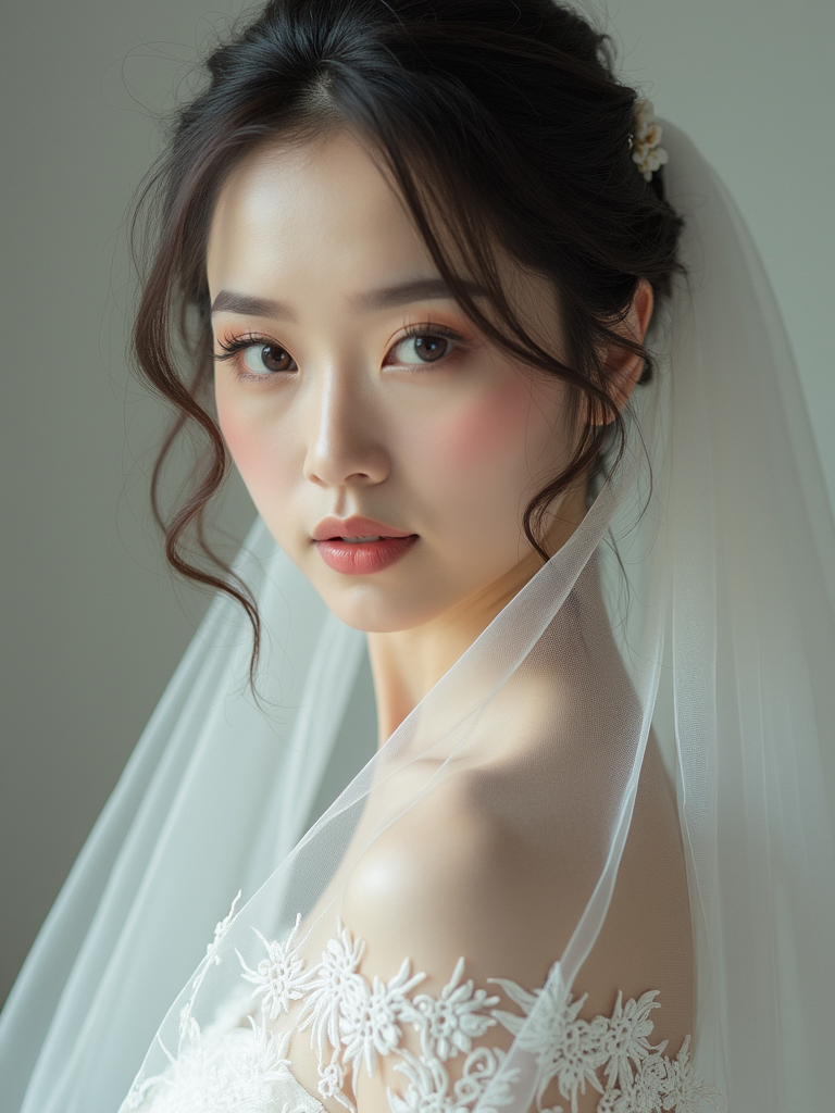 Elegant wedding portrait, showcasing sophisticated bridal or groom styling. Model wearing a delicate lace gown with a flowing veil . High-fashion photography style.