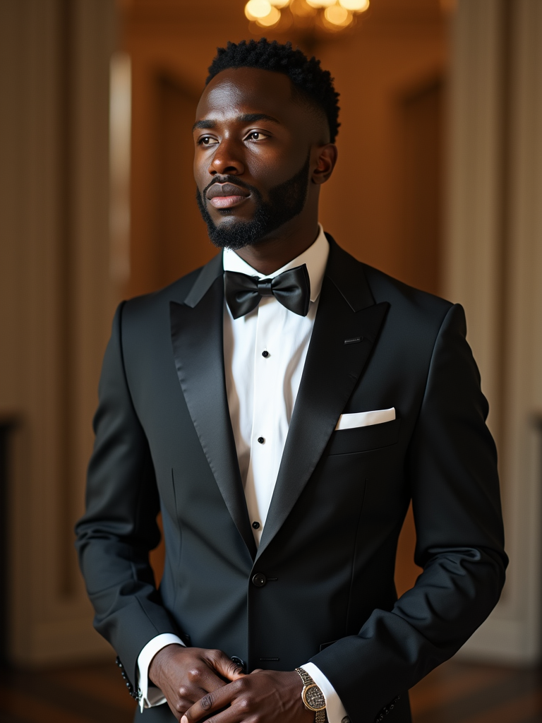 Elegant wedding portrait, showcasing sophisticated bridal or groom styling. Model wearing a classic tuxedo with a bowtie . High-fashion photography style.
