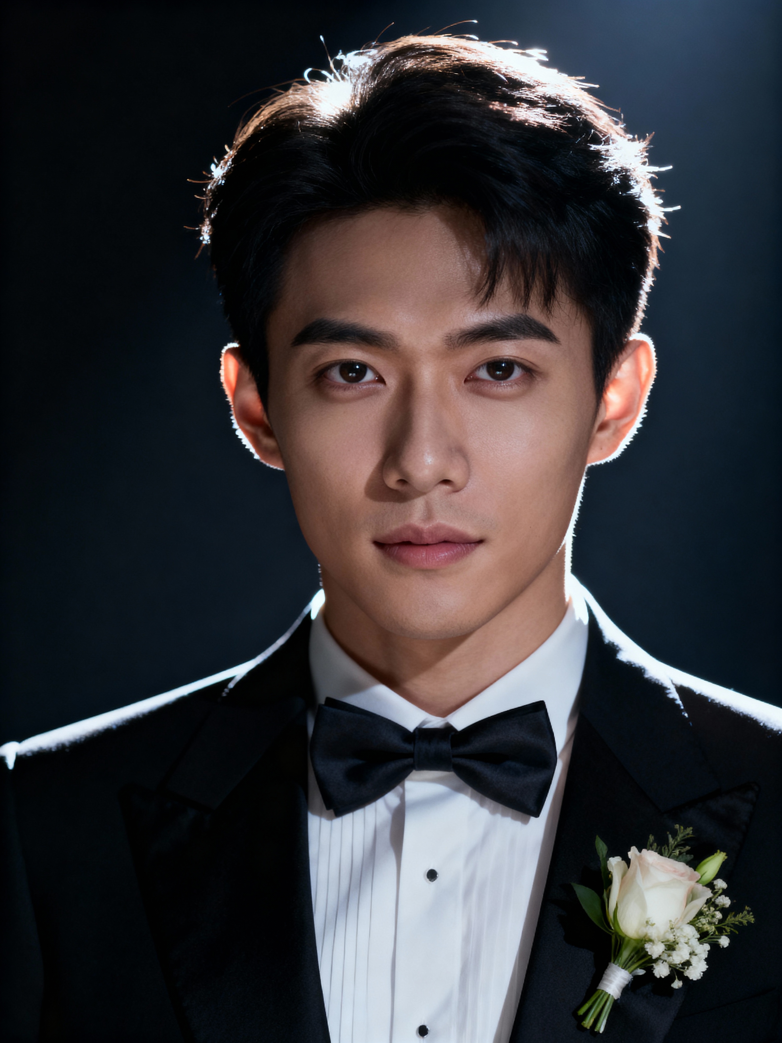 Elegant wedding portrait, showcasing sophisticated bridal or groom styling. Model wearing a classic tuxedo with a bowtie and boutonnière . High-fashion photography style.