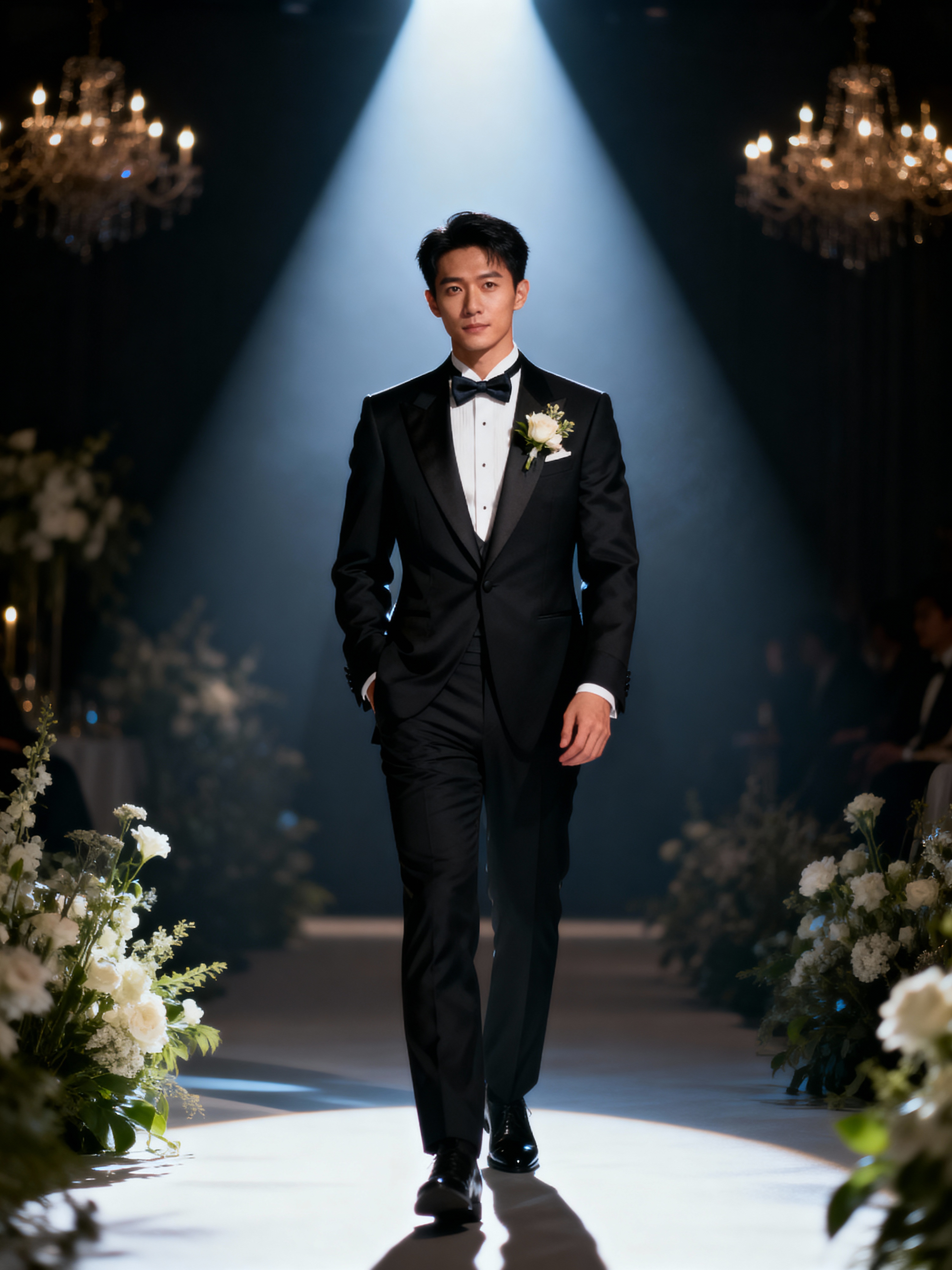 Elegant wedding portrait, showcasing sophisticated bridal or groom styling. Model wearing a classic tuxedo with a bowtie and boutonnière . High-fashion photography style.