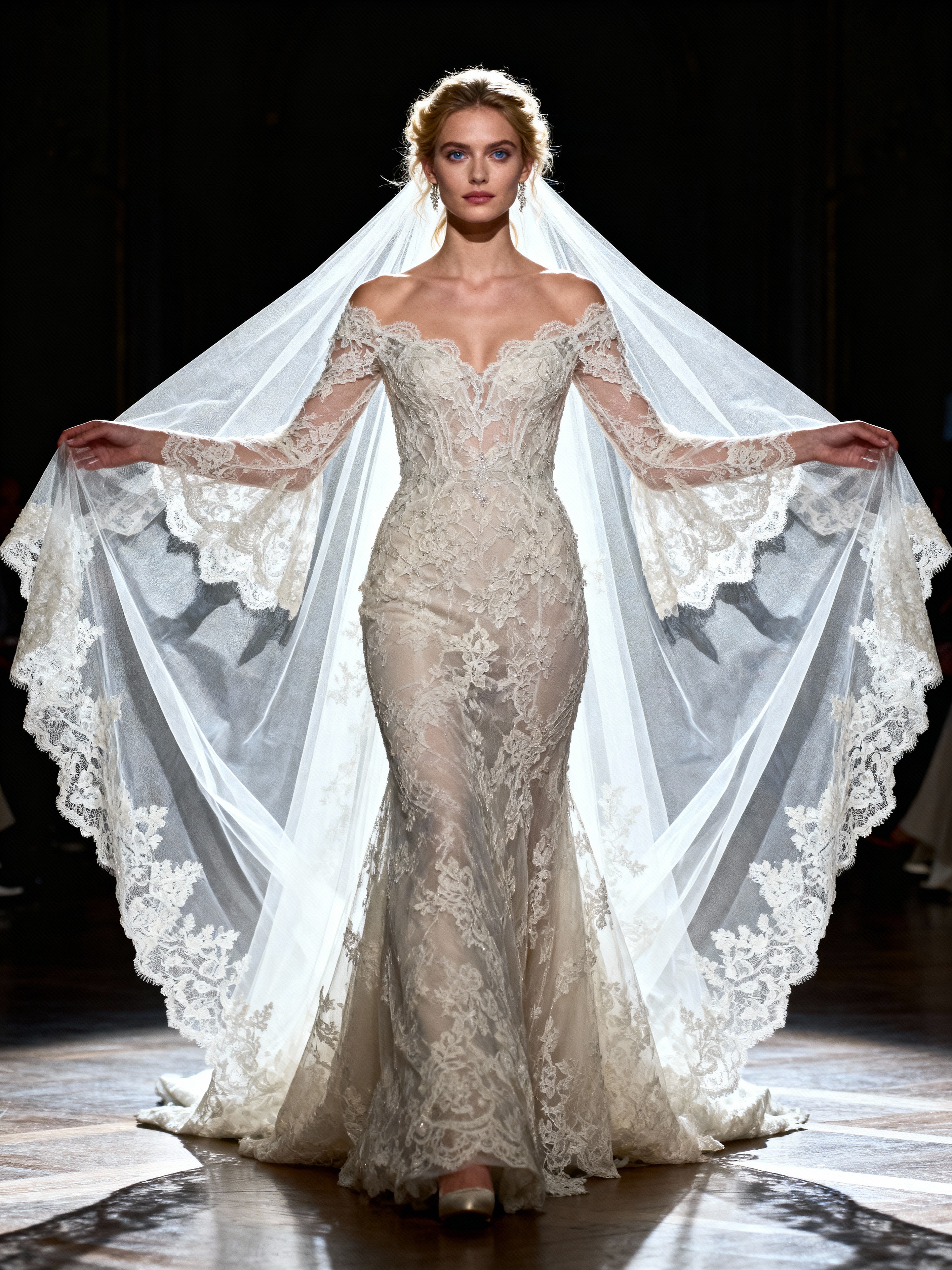 Elegant wedding portrait, showcasing sophisticated bridal or groom styling. Model wearing a delicate lace gown with a flowing veil . High-fashion photography style.