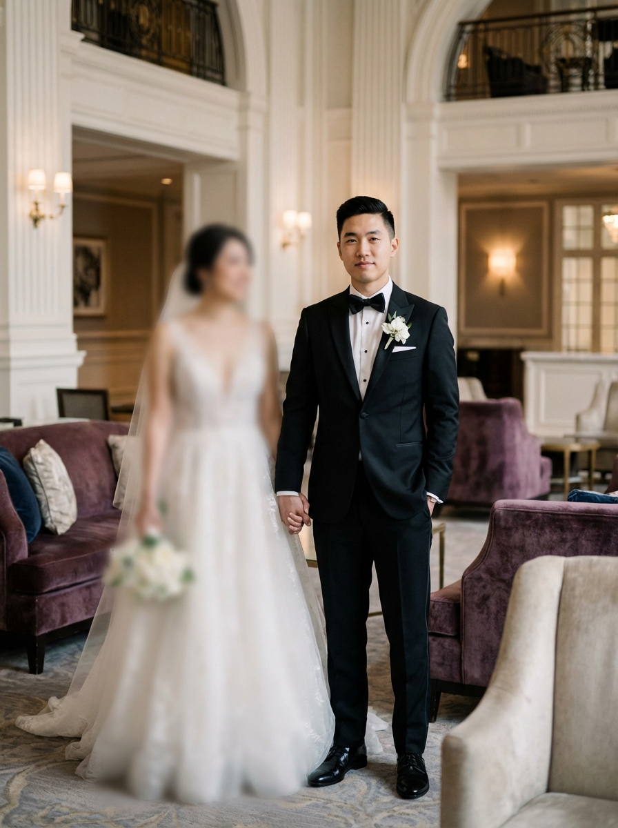 Elegant wedding portrait, showcasing sophisticated bridal or groom styling. Model wearing a classic tuxedo with a bowtie and boutonnière . High-fashion photography style.