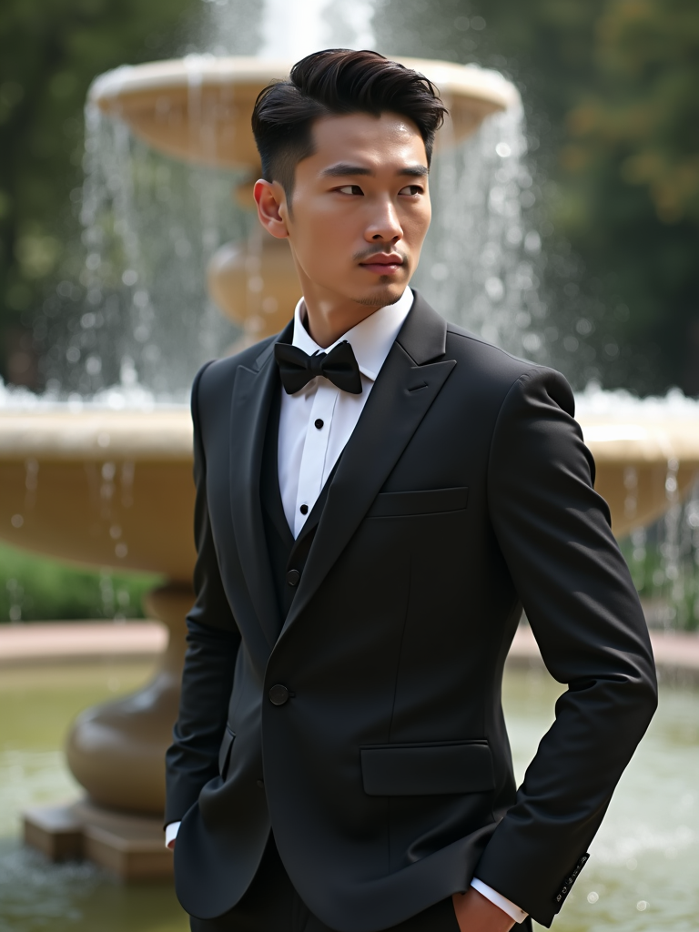 Elegant wedding pose by a fountain, cinematic wedding photography. Model wearing a dark tailored wedding tuxedo . Dreamy and visually stunning.
