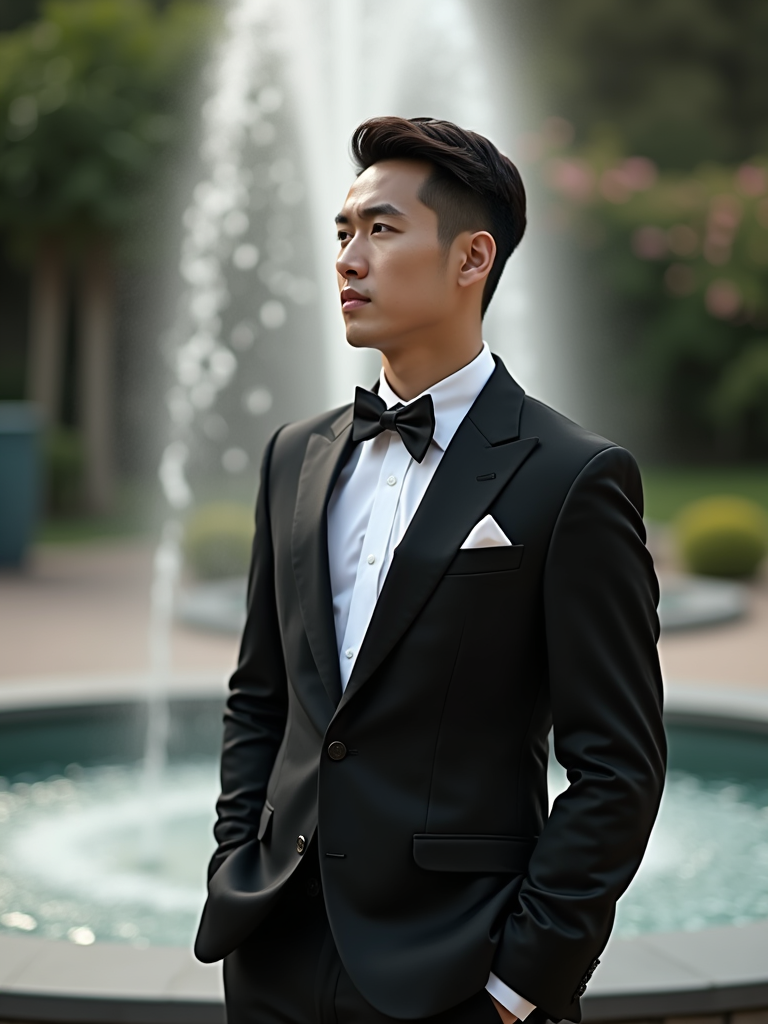 Elegant wedding pose by a fountain, cinematic wedding photography. Model wearing a dark tailored wedding tuxedo . Dreamy and visually stunning.