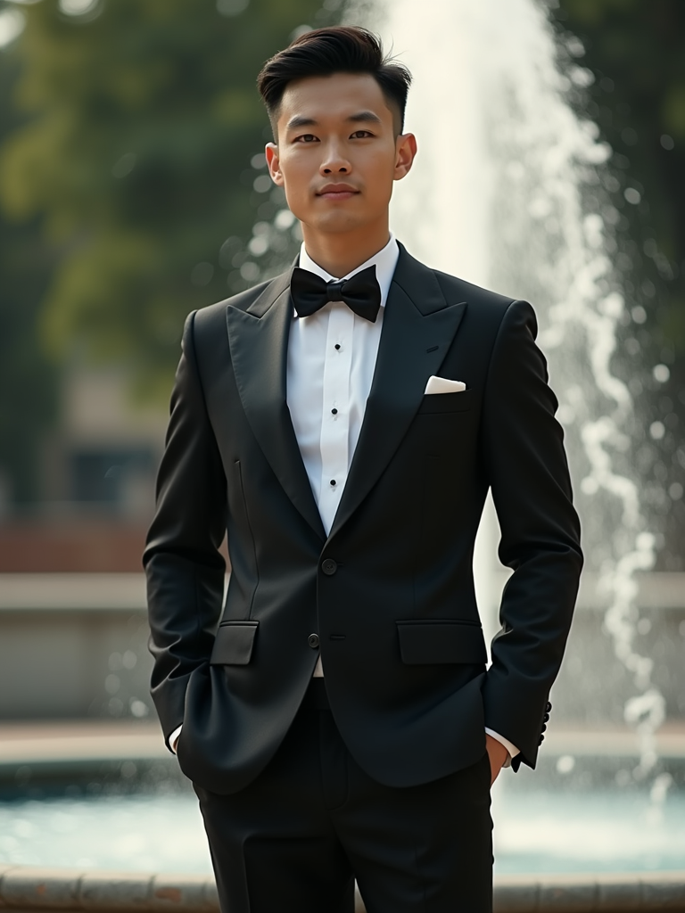 Elegant wedding pose by a fountain, cinematic wedding photography. Model wearing a dark tailored wedding tuxedo . Dreamy and visually stunning.