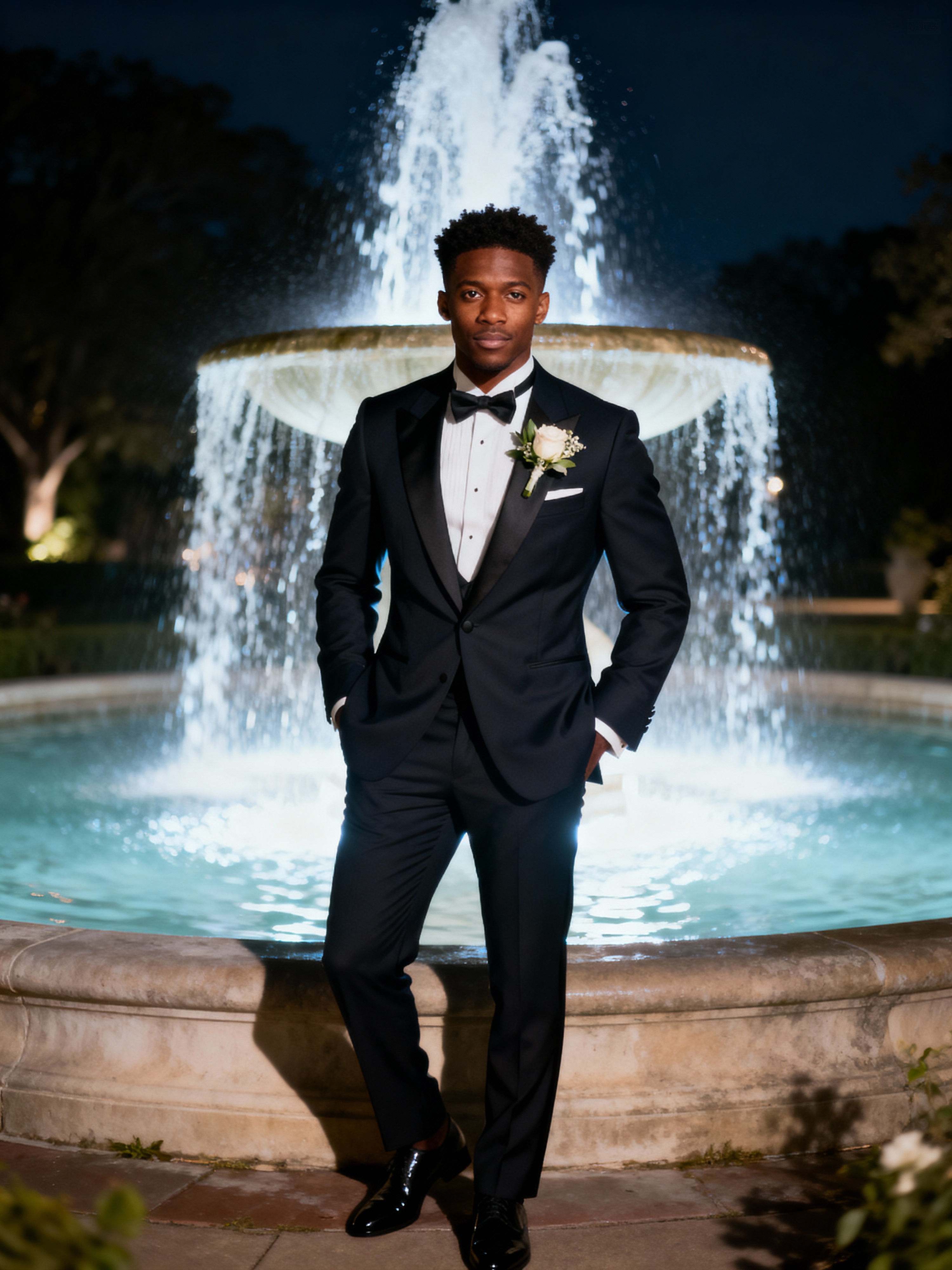 Elegant wedding pose by a fountain, cinematic wedding photography. Model wearing a dark tailored wedding tuxedo with boutonnière . Dreamy and visually stunning.