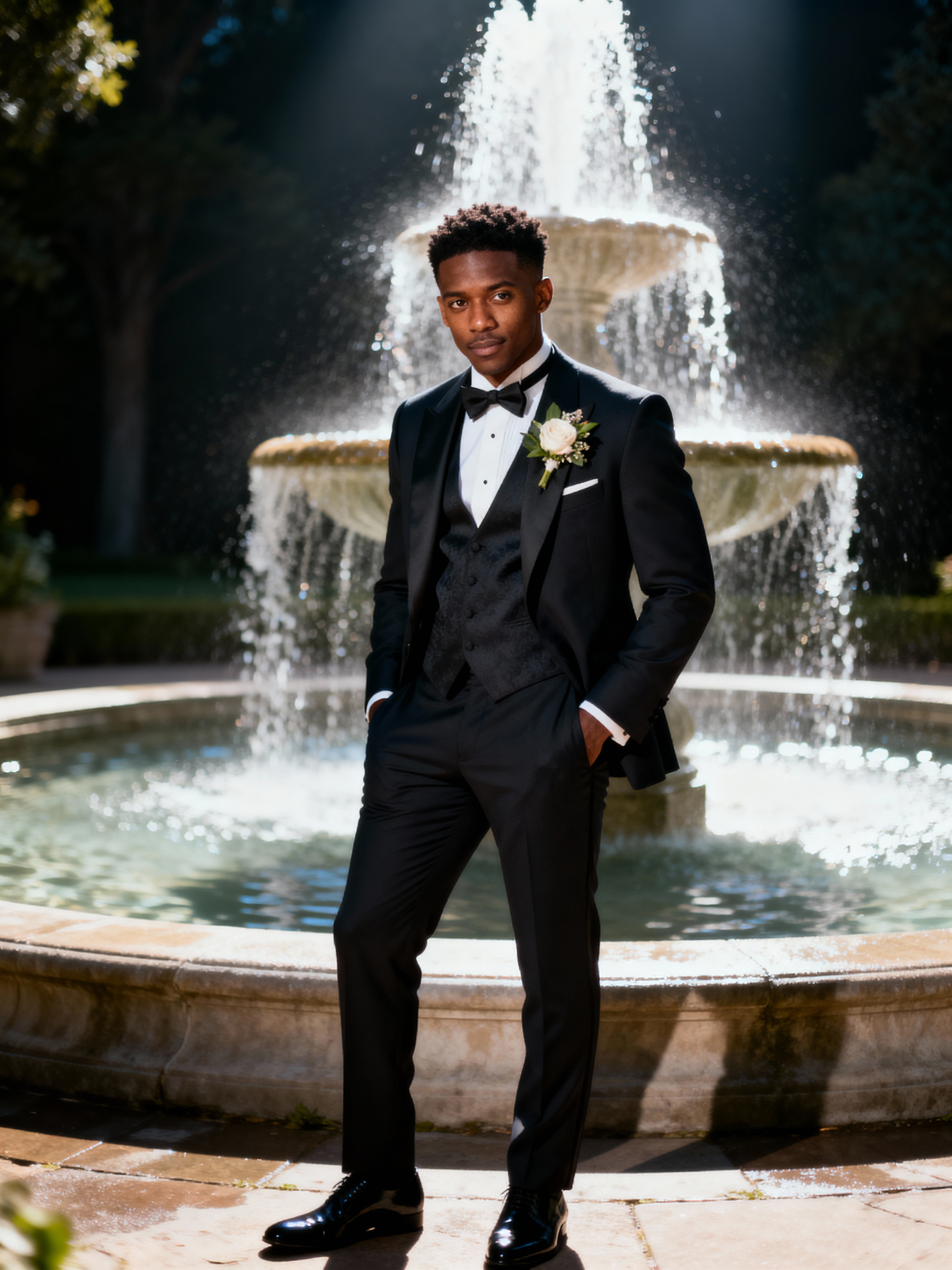 Elegant wedding pose by a fountain, cinematic wedding photography. Model wearing a dark tailored wedding tuxedo with boutonnière . Dreamy and visually stunning.