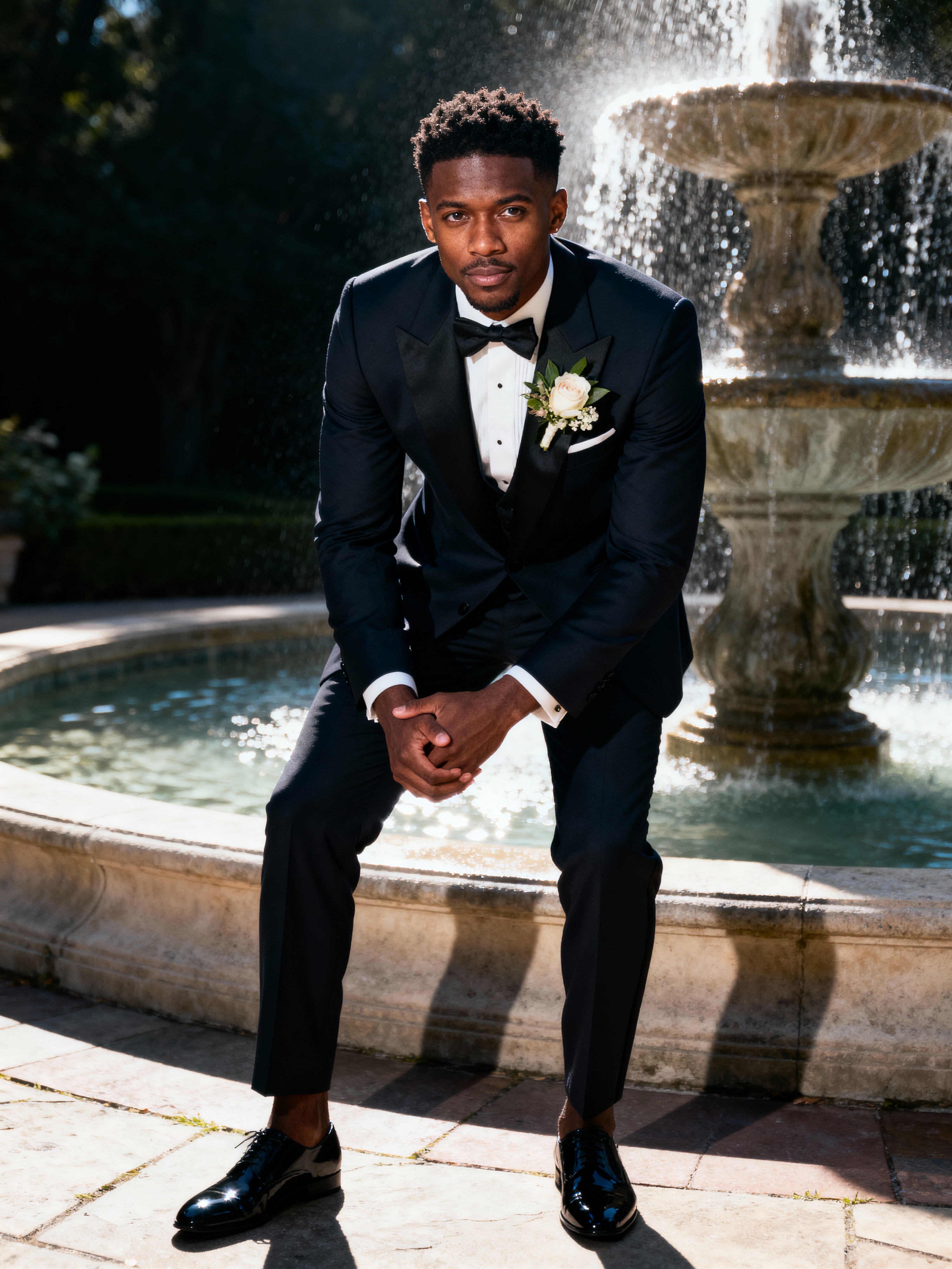 Elegant wedding pose by a fountain, cinematic wedding photography. Model wearing a dark tailored wedding tuxedo with boutonnière . Dreamy and visually stunning.