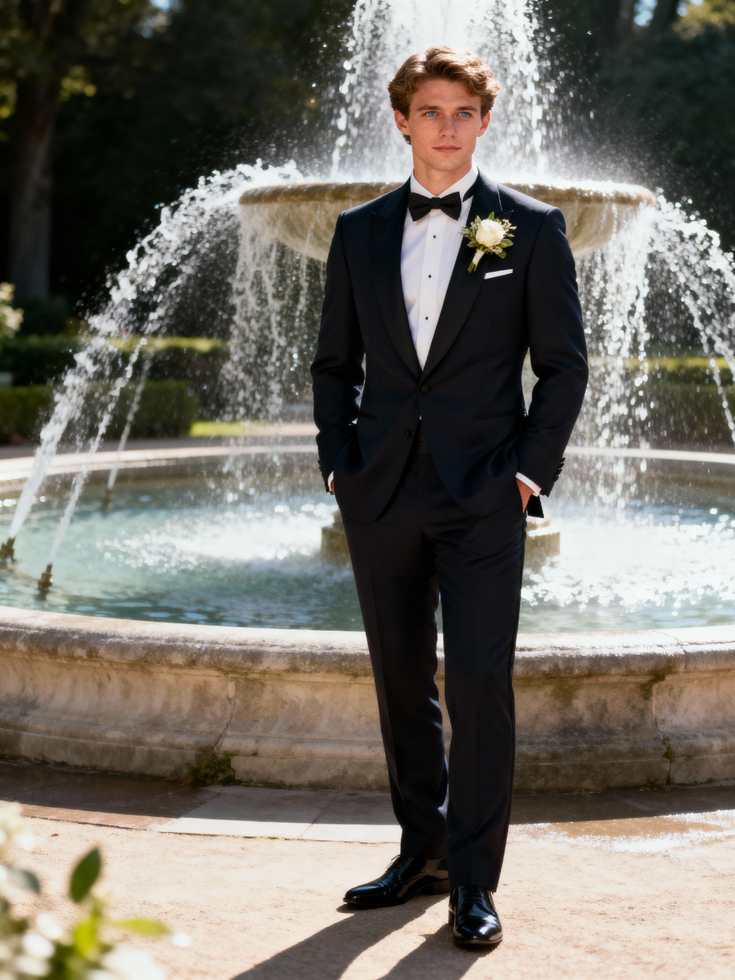 Elegant wedding pose by a fountain, cinematic wedding photography. Model wearing a dark tailored wedding tuxedo with boutonnière . Dreamy and visually stunning.