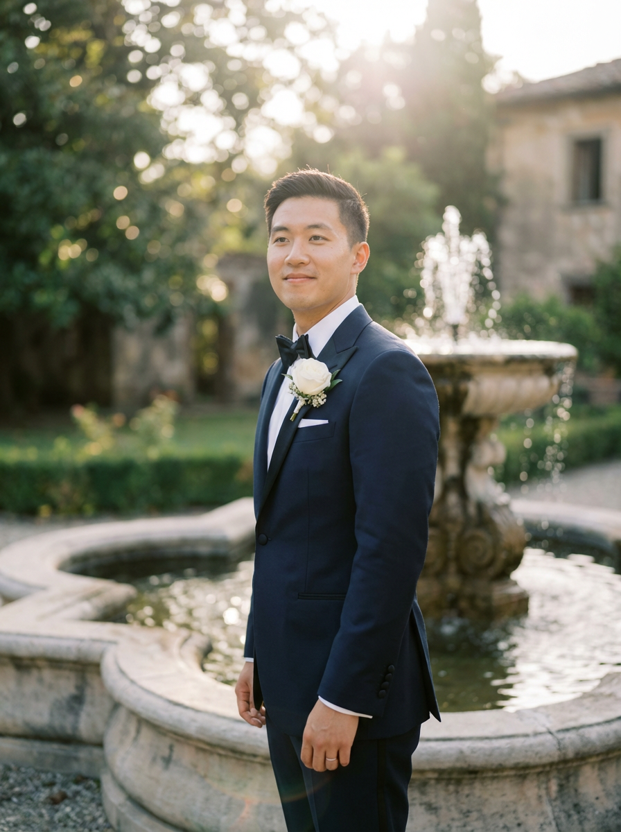Elegant wedding pose by a fountain, cinematic wedding photography. Model wearing a dark tailored wedding tuxedo with boutonnière . Dreamy and visually stunning.