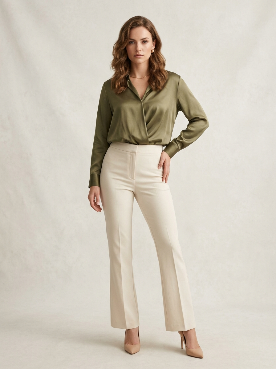 Elegant model in neural-rendered fashion campaign, premium silk blouse and tailored trousers, product-focused with high-end storytelling, soft volumetric lighting on neutral backdrop, dynamic three-quarter angle, powerful confident stance, magazine editorial aesthetic, hyper-realistic details, glossy finish.