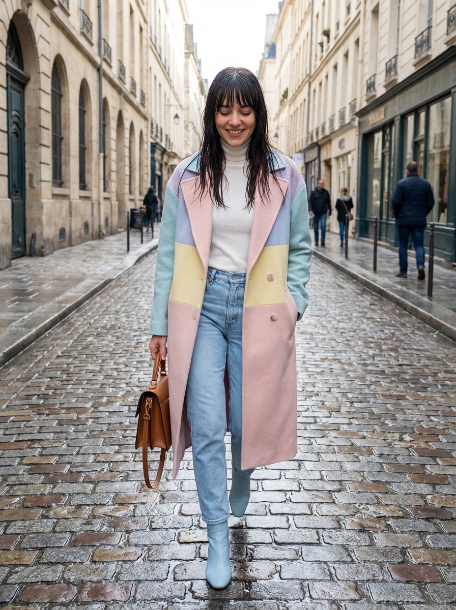 elegant model in pastel color palette (coat, turtleneck, boots), walking on cobblestone street, high-end street style fashion shoot