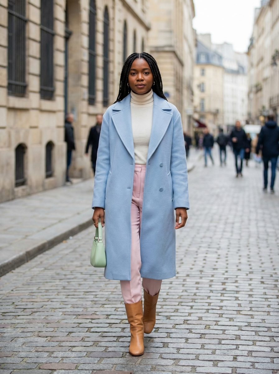 elegant model in pastel color palette (coat, turtleneck, boots), walking on cobblestone street, high-end street style fashion shoot